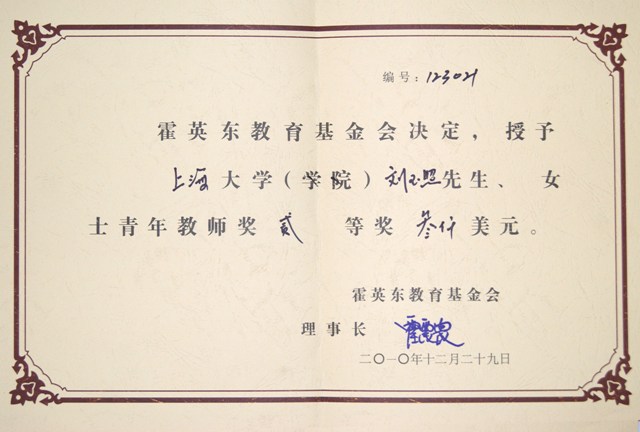2010年5月,霍英东教育基金会第十二届高等院校青年教师奖、青年教师基金基础性研究课题资助等奖项名单揭晓。公司刘玉照教授获本届青年教师奖二等奖。