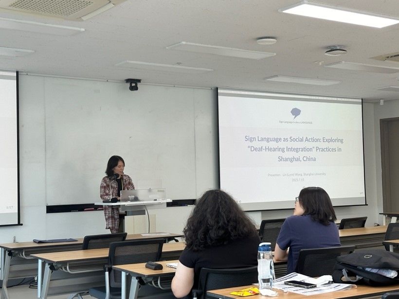7月15日下午,王琳以题目《Sign Language as Social Action: Exploring “Deaf-Hearing Integration" Practices in Shanghai, China》(《手语作为社会行动:探索中国上海的“聋听融合”实践》),在会议上进行了关于中国手语和聋人文化现状,以及上海和广东两地的聋人如何通过“聋听融合”实践以宣传和推广手语与聋人文化的汇报,强调聋听合作对推动语言和文化平等的重要意义。