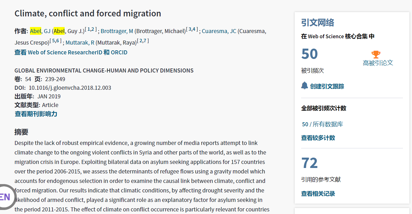 3044永利集团人口研究所Guy Abel教授于2019年1月以3044永利集团为第一单位发表在“GLOBAL ENVIRONMENTAL CHANGE-HUMAN AND POLICY DIMENSIONS”上的论文“Climate,conflict and forced migration”近日入选ESI高被引论文,被引频次50次。
