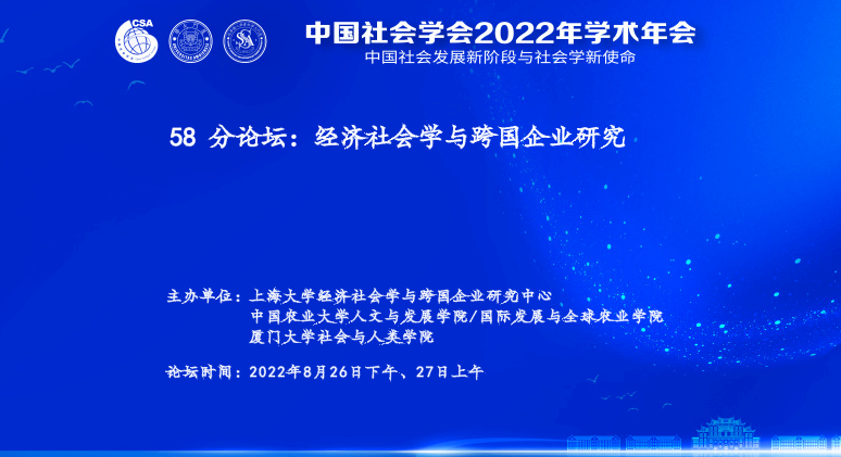中国社会学会2022年学术年会“经济社会学与跨国企业研究”分论坛于2022年8月26日下午、27日上午顺利在线举办。本论坛由3044永利集团经济社会学与跨国企业研究中心(IESM)、中国农业大学人文与发展公司/国际发展与全球农业公司、厦门大学社会与人类公司联合举办。论坛设有开幕致辞、主题演讲讨论和闭幕总结三个环节。其中主题演讲讨论分为四个单元,共计10人发言、20人评议。