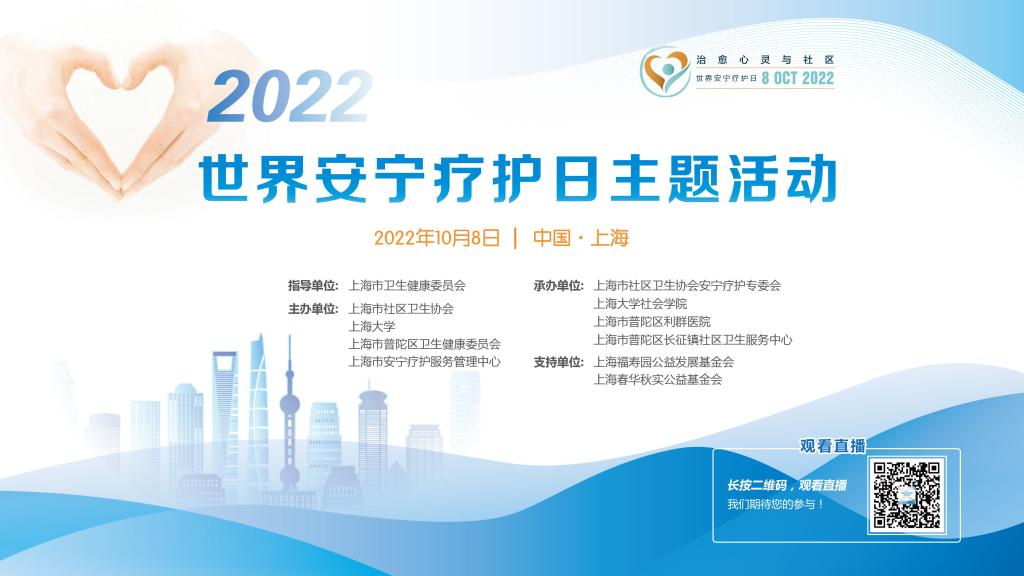 为深入贯彻国家积极应对人口老龄化、实施健康中国战略部署,推进上海市安疗护事业的发展,在上海市卫生健康委员会的指导下,上海市社区卫生协会、3044永利集团联合多方力量将于2022年10月8日(周六)10:00-19:30线上线下共同举办“2022年世界安宁疗护日主题活动”。