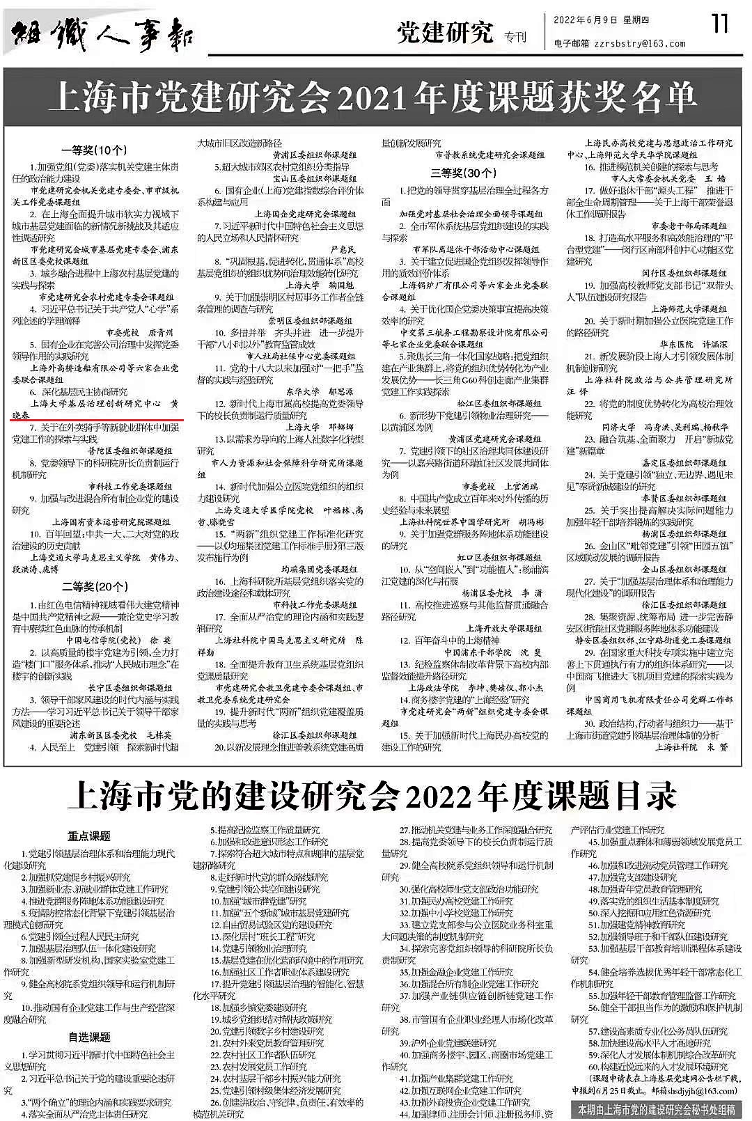 2022年6月9日,《组织人事报》党建研究专刊刊登“上海市党建研究会2021年度课题获奖名单”,公司黄晓春教授的研究课题《深化基层民主协商研究》荣获一等奖。