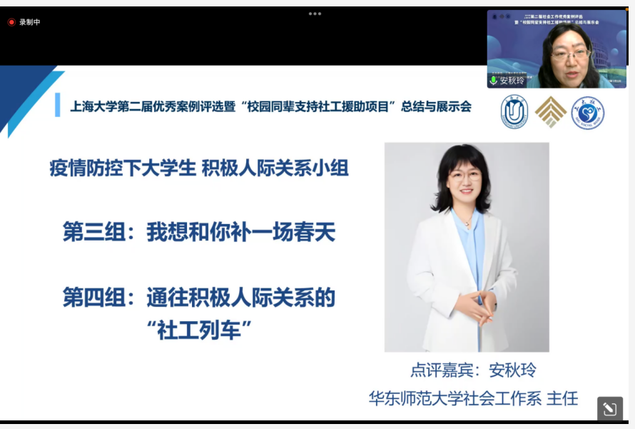 第三组和第四组分别由徐丽同学和窦文英同学进行汇报。华东师范大学社会工作系主任安秋玲副教授围绕理论意识、专业性、形式及伦理意识对两个小组进行了充分肯定。同时从聚焦问题与需求、设计活动的依据等方面提出了进一步改进意见。