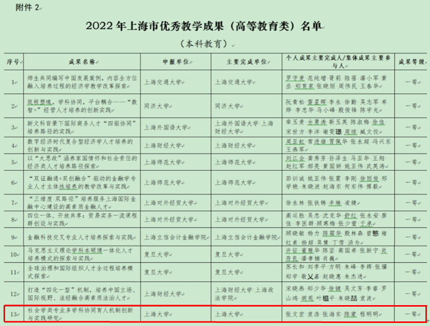 上海市教育委员会日前正式公布2022年上海市优秀教学成果名单(沪教委人【2022】33号),张文宏教授领衔的“社会学类专业多学科协同育人机制创新与实践研究”教学成果荣获2022年上海市优秀教学成果(高等教育类)一等奖