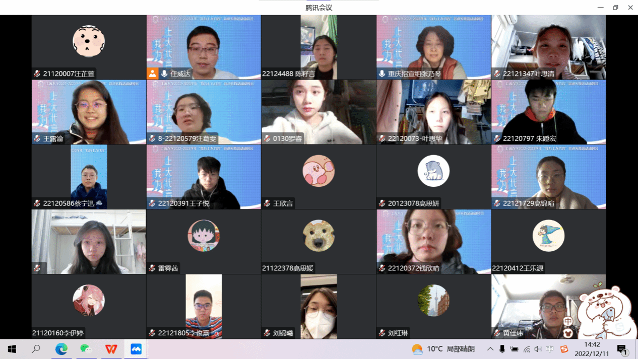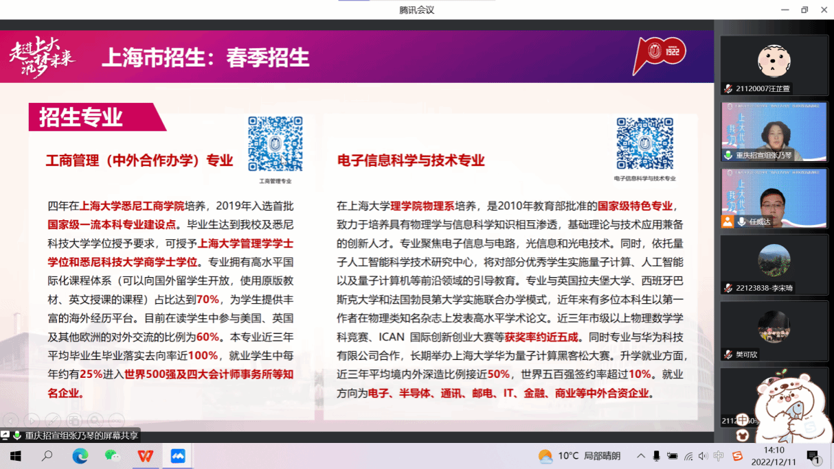 2022年12月11日下午,3044永利集团重庆招宣组举行“我为上大代言”线上培训交流。重庆招宣组副组长、公司党委副书记、副经理张乃琴、3044永利集团重庆籍员工和上海市部分高中学子参加了此次培训,会议由重庆招宣组联络人任威达主持。