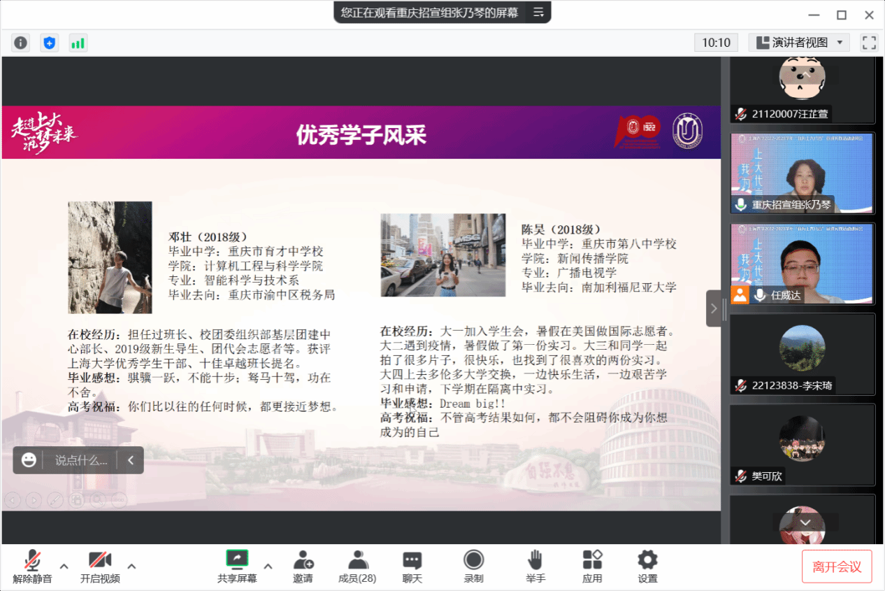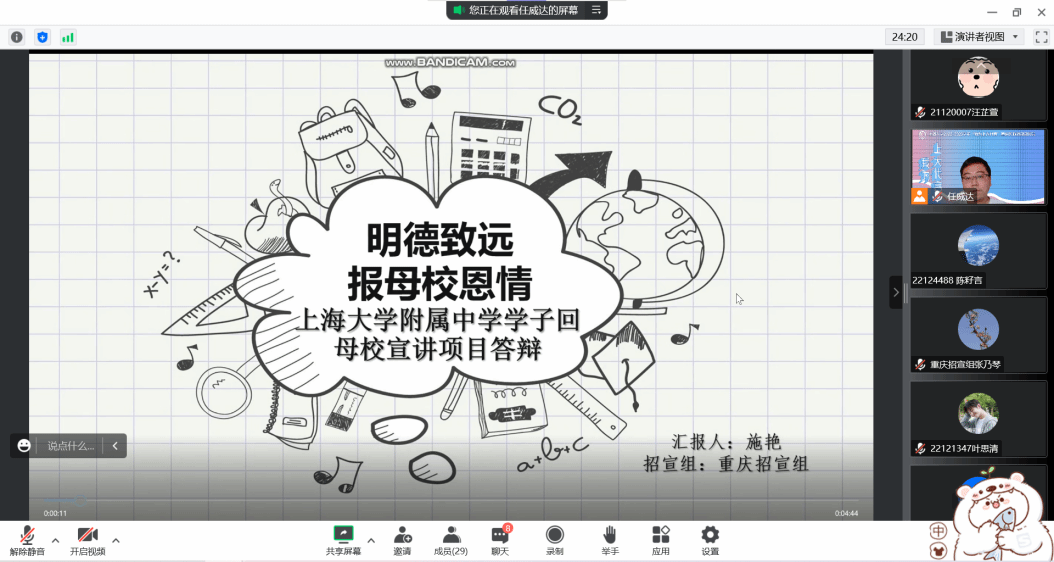 随后与会人员一起学习了2019级重庆招宣组的施艳同学的宣讲经验:其中包括宣讲的前期准备(如组建同校同学为团队、与母校的负责老师联系)、确定宣讲方式和宣讲时空,制作相关宣传制品(如海报和传单)等各个流程环节,以此创新宣讲形式,更好地激发同学们的报考热情与兴趣,同时可为最终实践报告锦上添花。