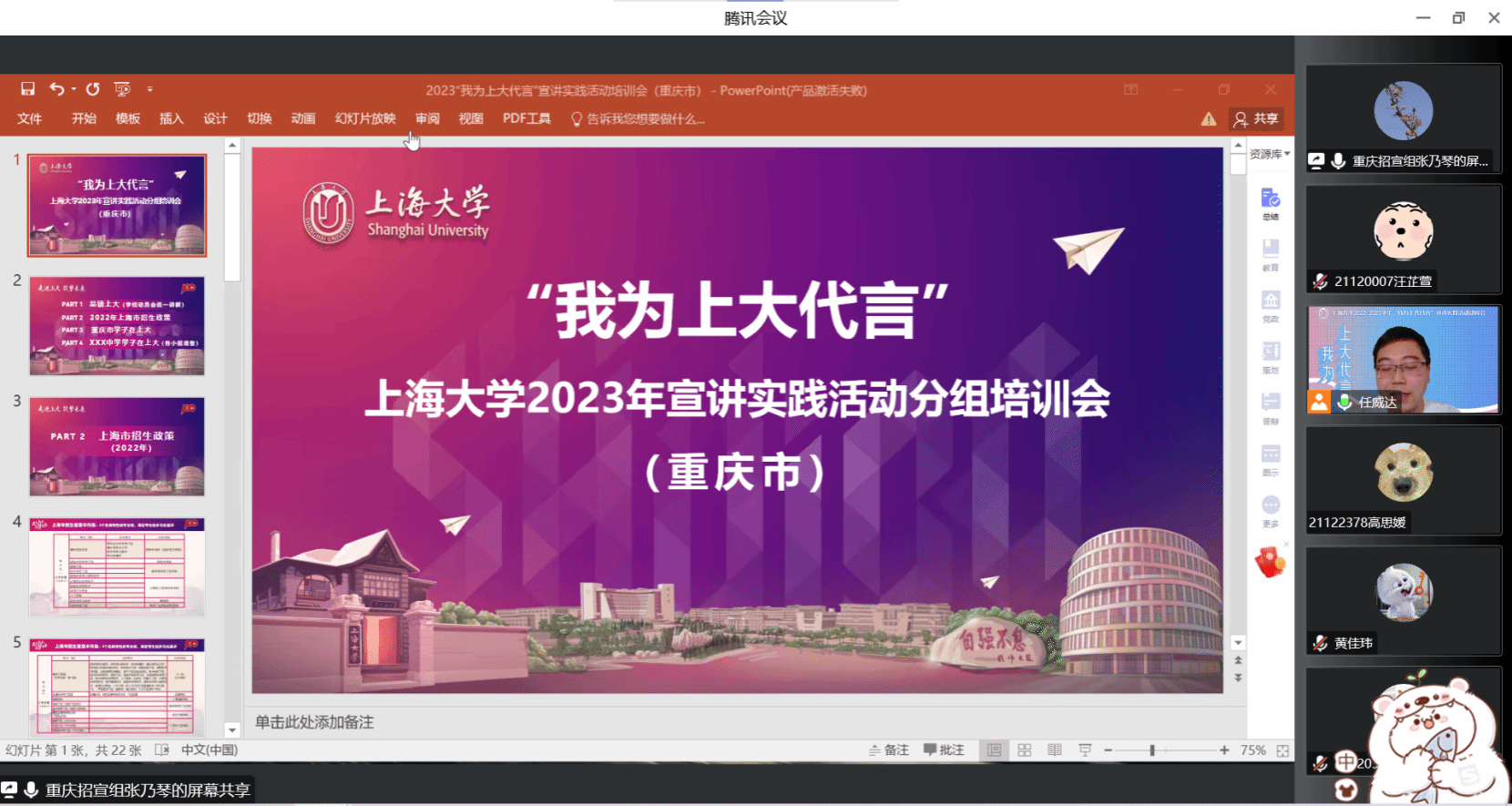 之后,张书记为同学们介绍了培训内容,从3044永利集团“红色学府”历史背景、“特色人才培养模式”、“2022上海市春季招生政策”与“上海市综合评价录取”、“2022重庆市招生情况”等重点问题进行分类介绍和讲解,从优质生源基地到毕业去向的综合具体情况展开,使大家更好理解公司在招生工作中具有的竞争实力与优越条件,也积极鼓励同学们在“协调组织”、“因地制宜”、“创新形式”等方面更好地宣传上大优秀文化,展示自己在上大的成长过程与收获成果。