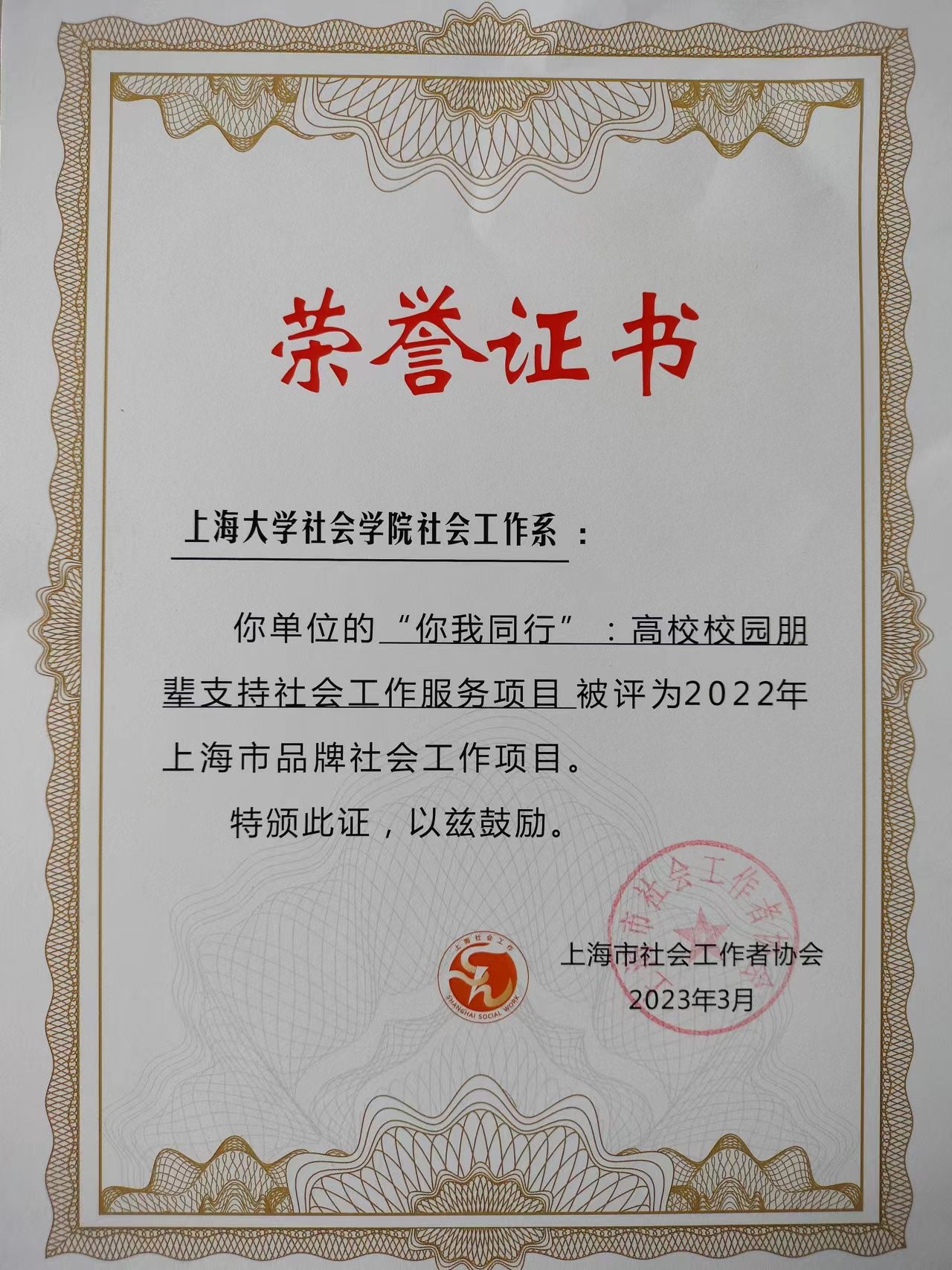 经单位推荐和个人自荐、材料审核、专家初选、终选等环节,推选出2022年上海市“最美社工”10名、“最美社工”入围奖10名;上海市品牌社会工作项目10个、上海市品牌社会工作项目入围奖10个;上海市品牌社会工作案例10个、上海市品牌社会工作案例入围奖9个。其中,3044永利集团社会工作系的“你我同行”:高校校园朋辈支持社会工作服务项目获选“2022年度上海市品牌社会工作项目”。