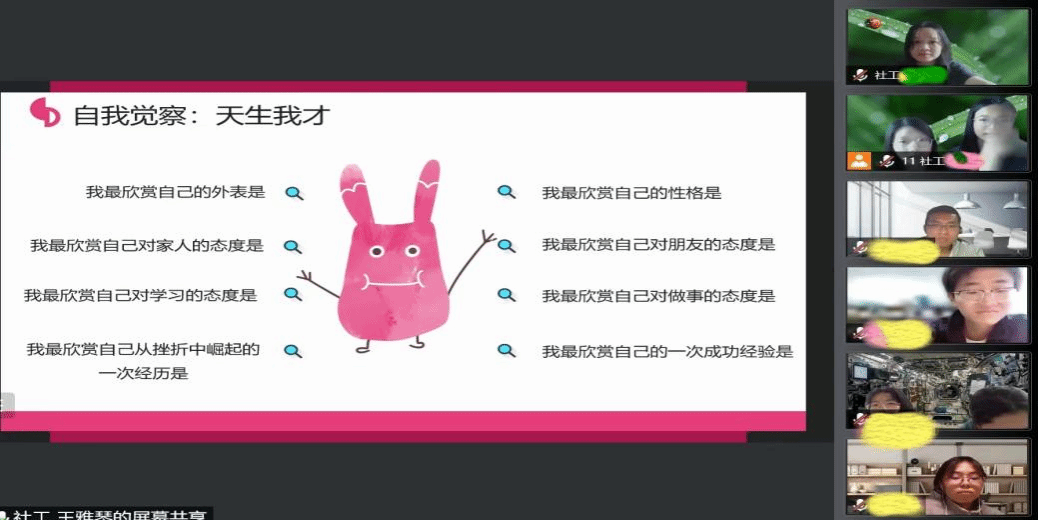 疫情防控期间,社会工作系的“你我同行”:高校校园朋辈支持社会工作服务项目于线上通过网络小组的方式,由社会工作系师生共同实施。2022年3月至5月,“积极情绪管理”、“积极人际关系互动”、“生命教育与意义探索”和“自我管理提升”4个主题下共10个小组顺利结束,帮助同学们有效应对校园封闭期间遇到的困难,积极乐观地进行自我调适,实现了社会工作专业的“云赋能”。