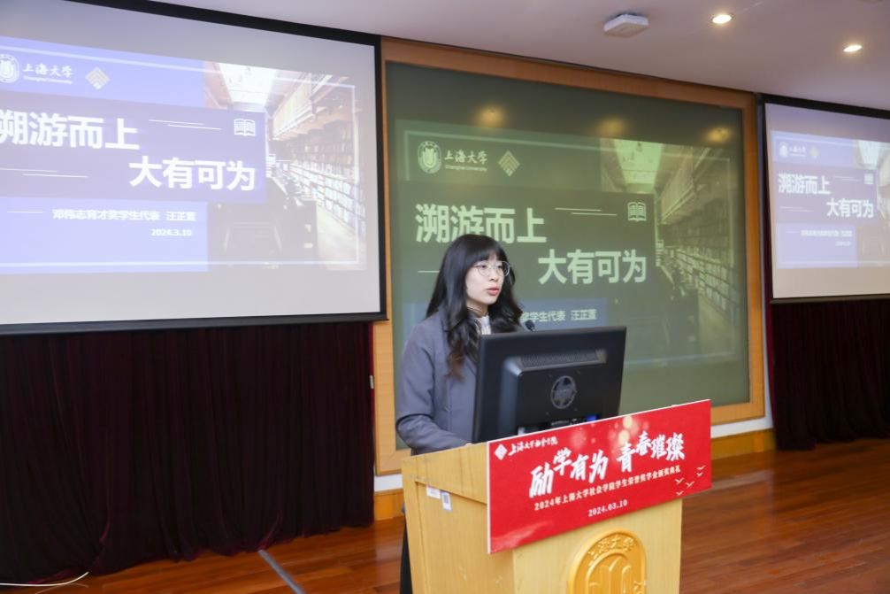 在热烈隆重的颁奖仪式后,郑沅芷、汪芷萱、吕思颖三位同学作为获奖员工代表依次上台分享。郑沅芷同学谈到,真正的社会学来源于自己的生活,要努力构筑自己的精神世界,用社会学的想象力激发和反思社会问题,从中找到个人成长的力量。汪芷萱同学紧扣自身经验,向同学们建议社会学人不仅要有“千里眼”,更要深耕学业,“知书”而后“达礼”,用社会学之“矢”,去射社会问题之“的”。吕思颖同学从人口学学习过程中的具体学习经验和论文发表步骤出发,深入讲述了应当如何积攒自己的科研“小目标”。