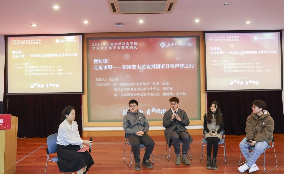 为进一步加深同学们对田野调查的理解和认识,主持人王达然与田野调查奖获奖员工代表进行了以“走近田野——回应宏大关切到倾听日常声音之间”为主题的微访谈。在谈到海外田野遇到的困难和经验时,熊健然同学建议大家要时刻学习的态度,边学习边进步,不断学以致用,从“走出去”到“走进去”逐步深入。胡煌同学建议大家要时刻保持好奇心和学习的能力,破除刻板印象,潜心沉浸在当时当地中去。在谈到研究的灵感来源与资料收集时,梁佳妮同学坦言要做好田野,就一定要做好现象描述和理论对话,走进田野就是在实践的过程中回应自己的问题,一边回应,一边发散。在谈到“如何处理好田野与理论之间的关系”时,高永林同学结合自身经验提出没有社会是混乱无序的,对进入的社会分类,找到关键要素进而找到该社会框架,这样通过分类找到社会结构,以便找到更适合自己的理论。