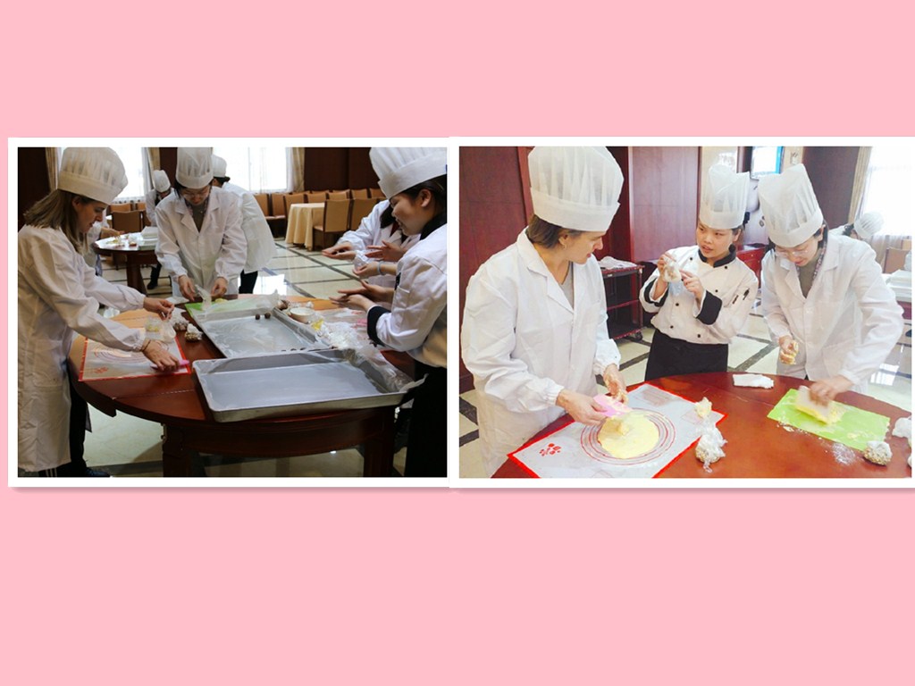 本次烘焙制作内容主要是清蛋糕和可可饼干制作。活动开始前,乐乎集团烘焙师丹丹老师已准备好分装的食材,烘焙服和相关道具等。在简单准备后,我们的女老师们就逐步进入了状态,并且也拿出了各自的看家本领,积极地参与到烘焙饼干的活动中来。大家一边操作一边交流着自己对烘焙的领悟,相互学习。我们的古巴籍友人因为有过西式点心的制作经验而熟知过程,所以在个人动手制作环节,轻盈飞快地完成了饼干制作。我们则是紧随其后,跟着其步骤和糕点师的指导下也慢慢完成,就这样态度认真而步骤扎实,井然有序、齐心协力地完成了多数人的第一次烘焙制作。
