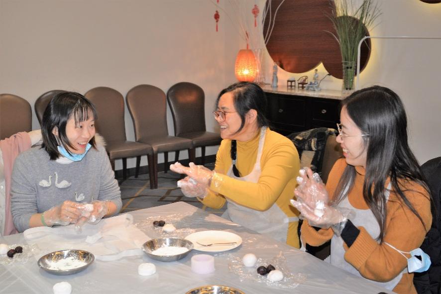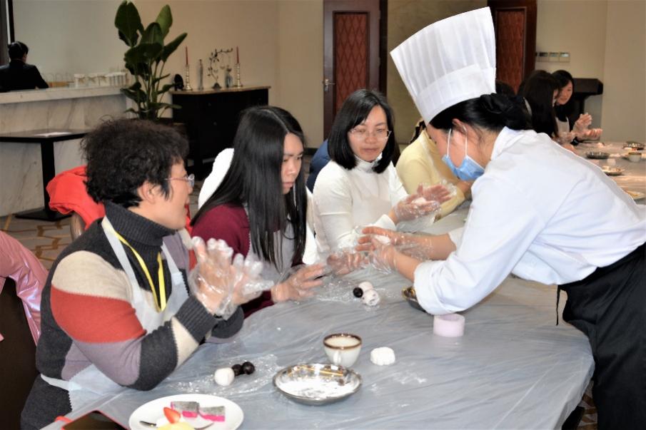 随后,大家在烘焙老师的讲解下开始了烘焙体验活动。大家纷纷系上围裙、撸起袖子、戴上手套,开始制作女神节特供樱花冰皮糯米团,揉面、包馅儿,印花,大家都纷纷拿出动手做面食的看家本领,相互借鉴学习与比拼。现场洋溢着阵阵欢声笑语,一派其乐融融的景象,在轻松氛围中共度节日。