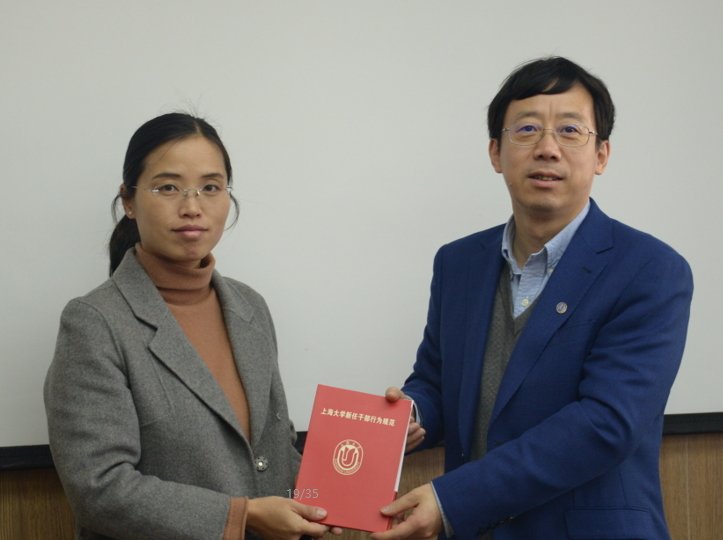 (段勇书记为纪莺莺副经理颁发干部行为规范手册)