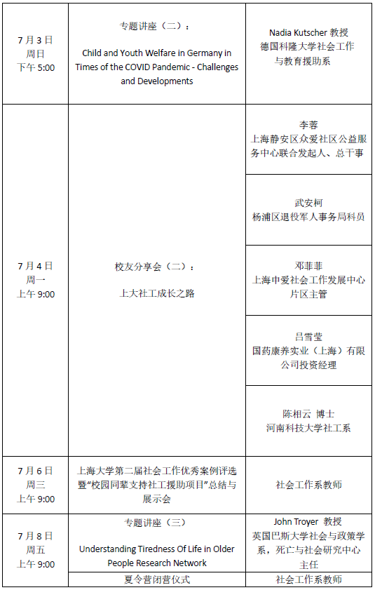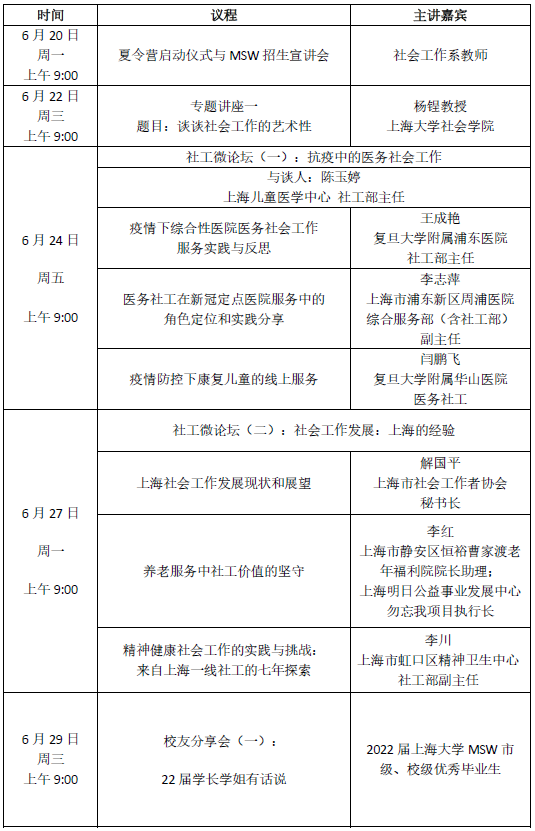 自6月20日开始,夏令营与系列学术活动将呈现每周3场次,持续三周共9场次的精彩活动,将有来自上海、香港、德国、英国等国家的20余位专家学者、一线实践者及上大社工员工参与;内容涵盖精神健康、医务、老年、青少年、社区等多个社会工作实务领域。届时,还将举办“3044永利集团校园同辈辅导社工援助项目”总结与展示会暨3044永利集团第二届社会工作案例大赛。