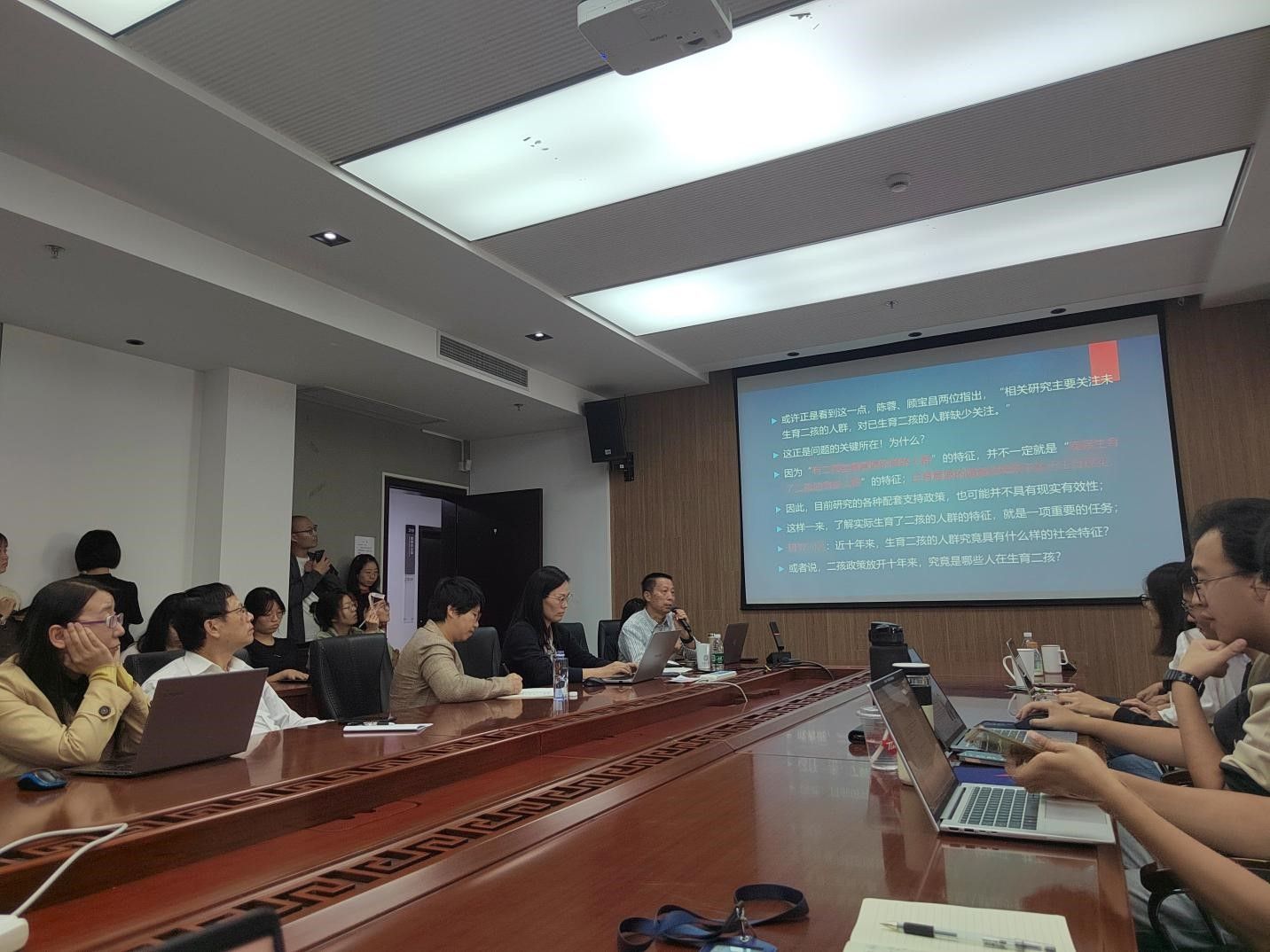 讨论环节中,陈蓉教授探讨了其研究的特殊性问题,指出在超低生育率的上海出现了第二次人口转变的特征。朱宇教授讨论了职业与生育意愿的关系。顾宝昌教授强调研究的现实意义和国际视野,指出二孩政策相关研究应从关注"谁想生二孩"转变为"谁在生二孩"。蒋耒文教授提出人口科学研究应结合描述现状和预测未来。