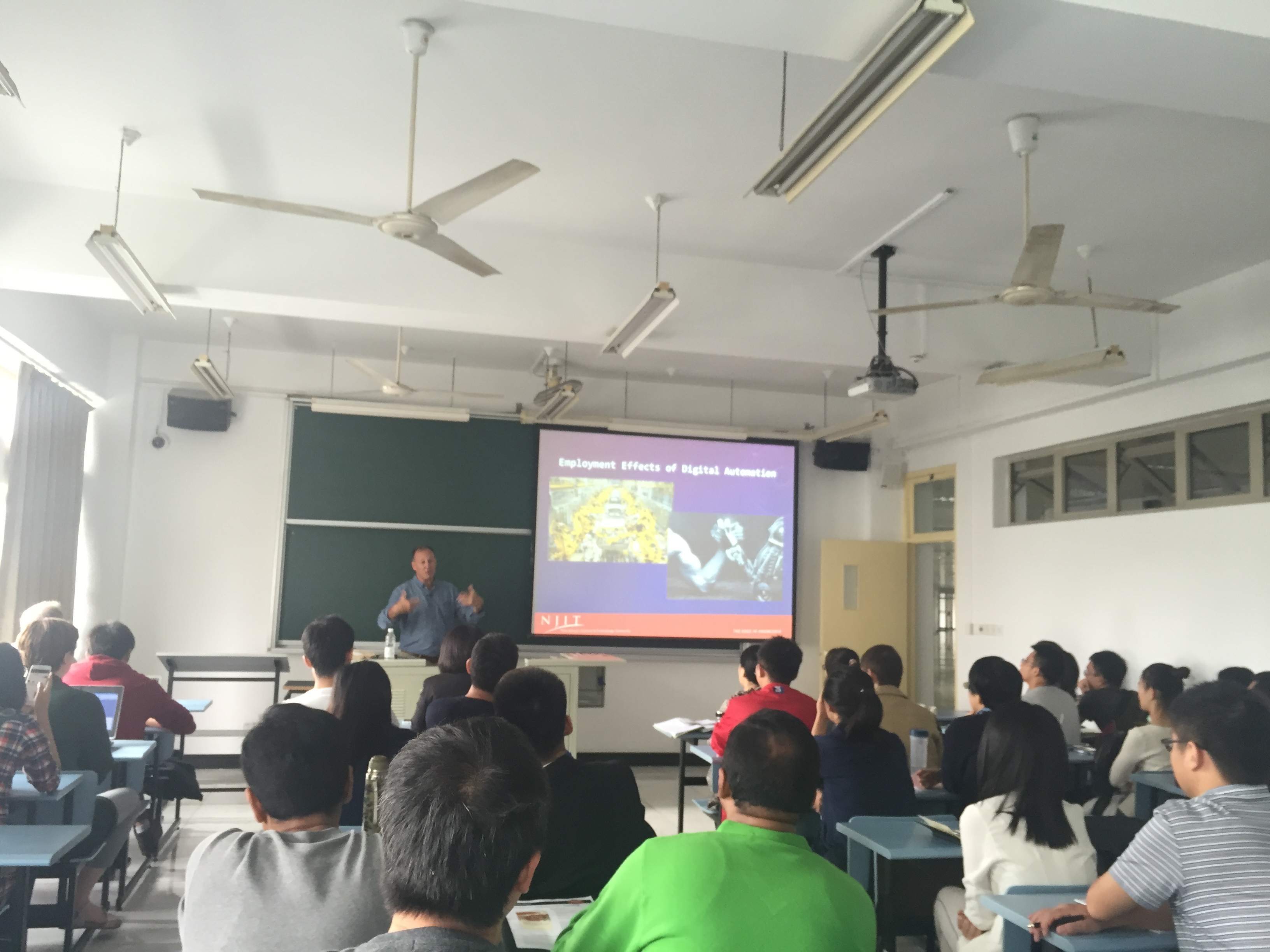 Maurie Cohen教授将讲座的重点放在"消费社会的未来"这一议题上,提出了在当代美国中产阶级日益萎缩、科技发展威胁劳动力市场这一大背景下,所谓的"消费社会"是否将趋于消失的问题。在讲座中,Maurie教授反复强调就业、收入与需求、消费之间的关系,以及其在科技迅猛发展的当下所面临的新挑战;他介绍了针对这一前景学术界悲观、乐观的两种态度,并详细阐述了可能的对策。在讨论环节,员工们积极参与讨论,张敦福教授也以社会麦当劳化理论对日益理性化、去人工化的消费社会进行了精彩总结。