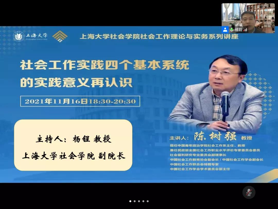 2021年11月16日晚,社会工作理论与实务系列讲座——“社会工作实践四个基本系统的实践意义再认识”在腾讯会议顺利举行。本次讲座诚邀中国青年政治公司社会工作系主任陈树强教授主讲,由杨锃副经理主持,来自全国各地的高校师生、社会工作者、社区工作者等三百余人线上参与学习和探讨。