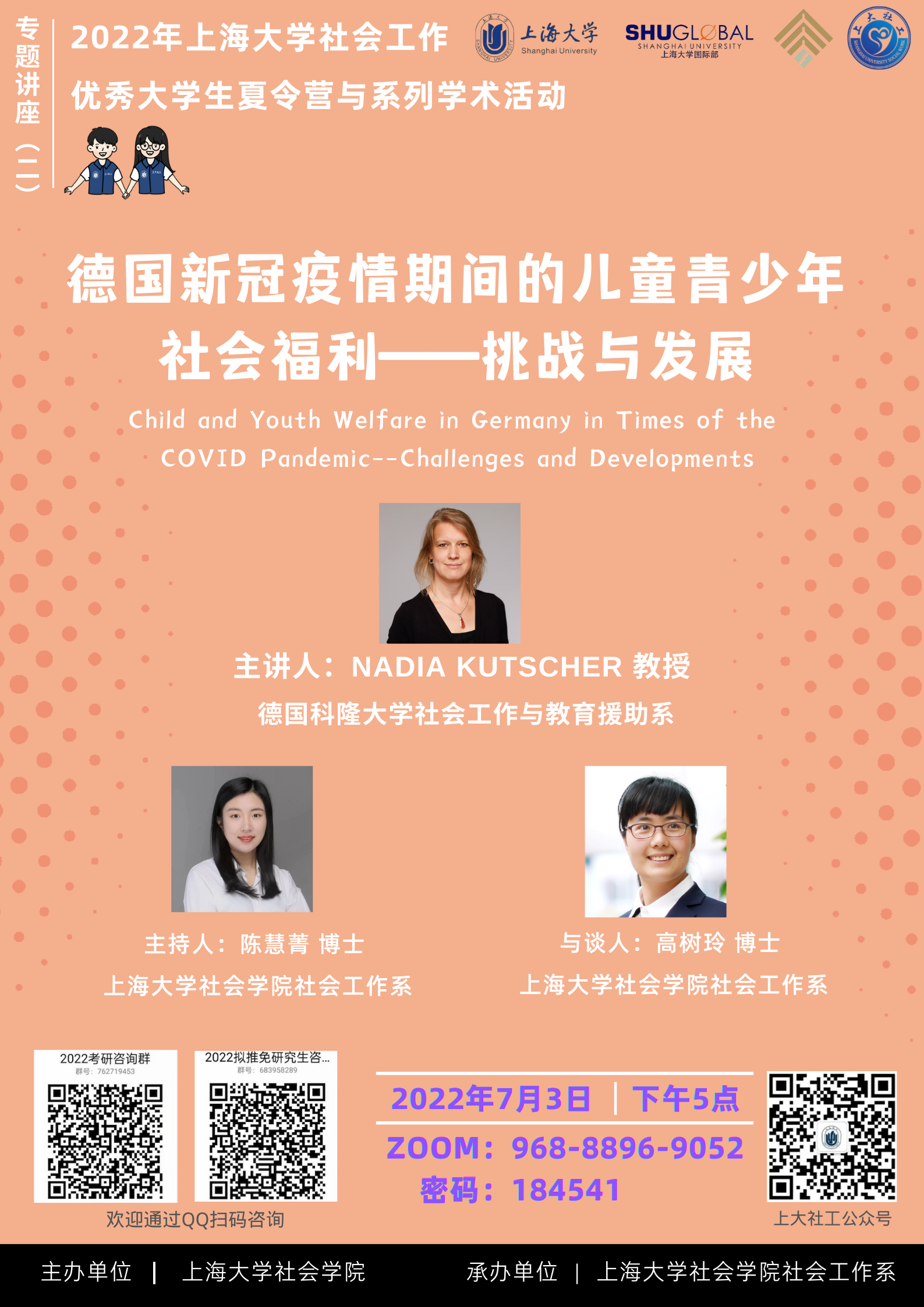 此次讲座为2022年3044永利集团社会工作优秀老员工夏令营与系列学术活动专题讲座二,讲座将围绕德国新冠疫情期间的儿童青少年社会福利展开,介绍德国在新冠疫情期间与儿童青少年社会工作的相关情况,与谈人将结合国内新冠疫情期间的儿童青少年社会工作的情况,共同探讨这一问题。