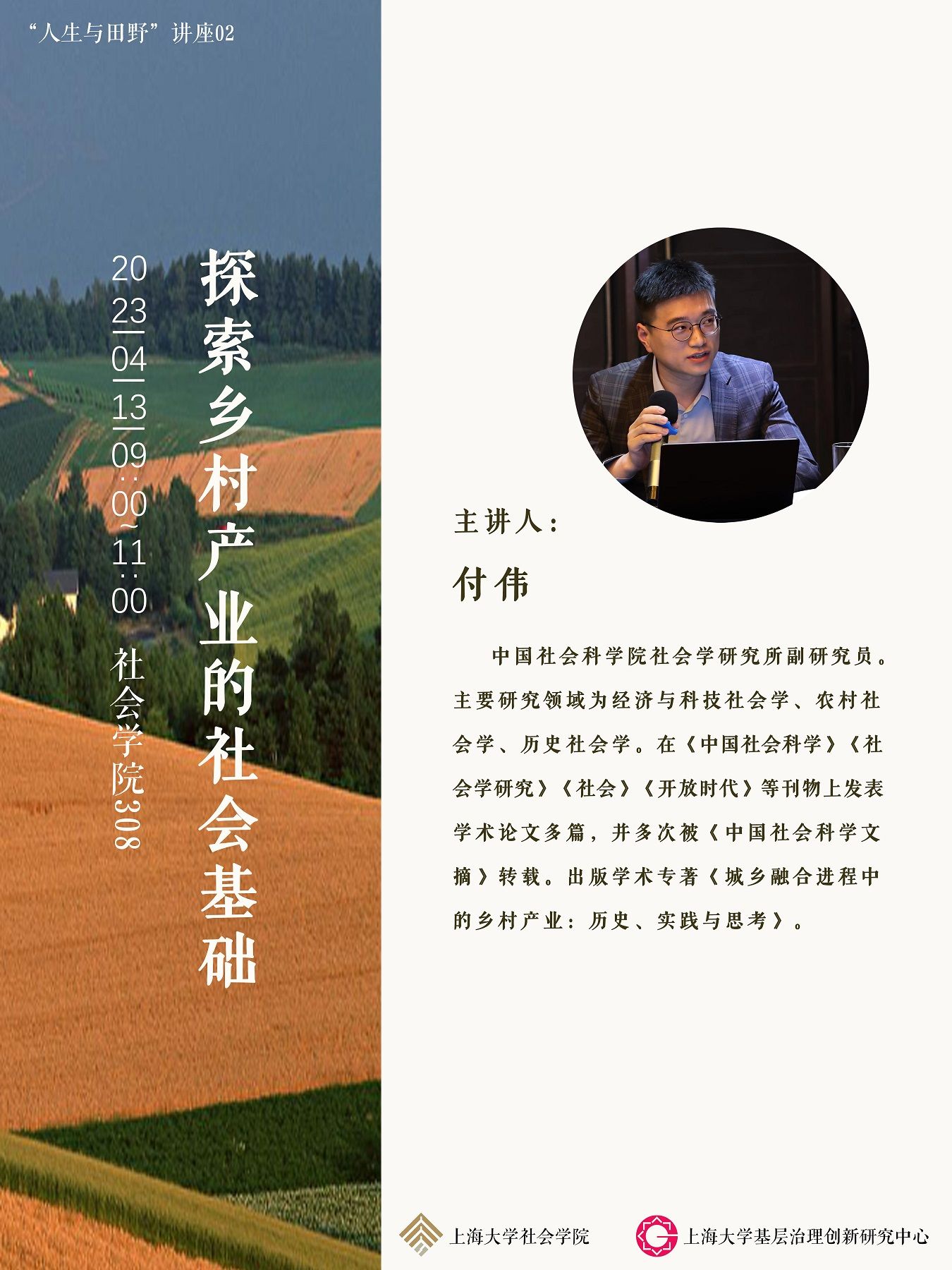 主讲人付伟,中国社会科公司社会学研究所副研究员。主要研究领域为经济与科技、农村社会学、历史社会学。在《中国社会科学》《社会学研究》《社会》《开放时代》等刊物上发表学术论文多篇,并多次被《中国社会科学文摘》转载。出版学术专著《城乡融合进程中的乡村产业:历史、实践与思考》。