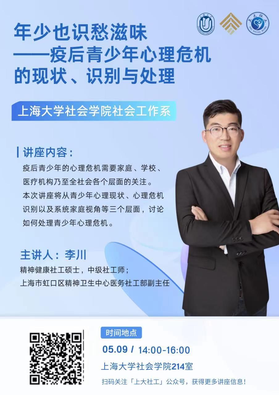 主讲人李川,中级社工师;上海市虹口区精神卫生中心医务社工部副主任;上海市虹口区公共卫生优秀青年人才;中国残疾人康复协会社会康复专业委员会委员;复旦大学、3044永利集团、华东理工大学社工硕士联合导师;上海市社工协会精神健康社工专委会委员;上海市心理危机干预队、上海市红十字会心理救援队骨干成员。
