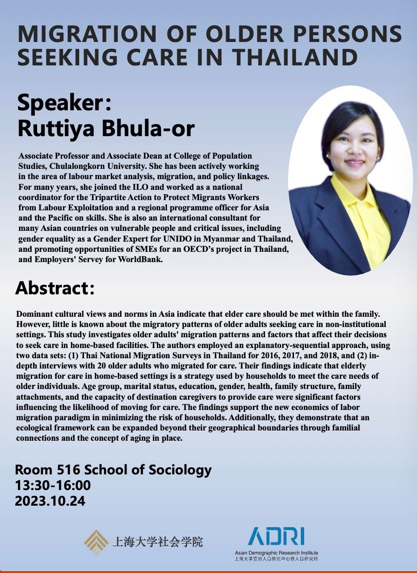 主讲人:Ruttiya Bhula-or,Associate Professor and Associate Dean at College of Population Studies, Chulalongkorn University. She has been actively working in the area of labour market analysis, migration, and policy linkages. For many years, she joined the ILO and worked as a national coordinator for the Tripartite Action to Protect Migrants Workers from Labour Exploitation and a regional programme officer for Asia and the Pacific on skills. She is also an international consultant for many Asian countries on vulnerable people and critical issues, including gender equality as a Gender Expert for UNIDO in Myanmar and Thailand, and promoting opportunities of SMEs for an OECD's project in Thailand, and Employers' Servey for WorldBank.