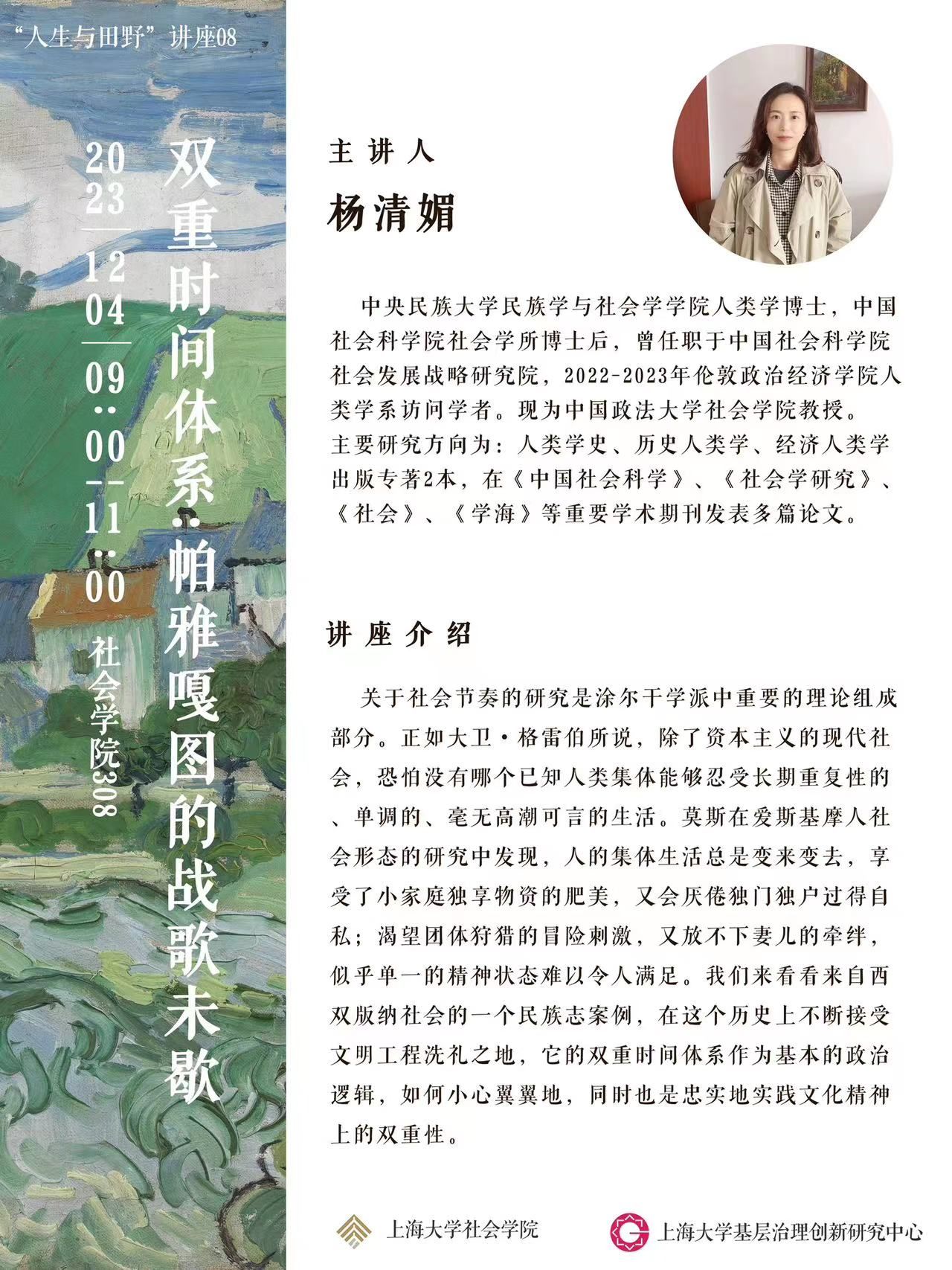 主讲人杨清媚,中央民族大学民族学与社会学公司人类学博士,中国社会科公司社会学所博士后,曾任职于中国社会科公司社会发展战略研究院,2022-2023年伦敦政治经济公司人类学系访问学者。现为中国政法大学3044永利集团教授。主要研究方向为:人类学史、历史人类学、经济人类学出版专著2本,在《中国社会科学》《社会学研究》《社会》《学海》等重要学术期刊发表多篇论文。
