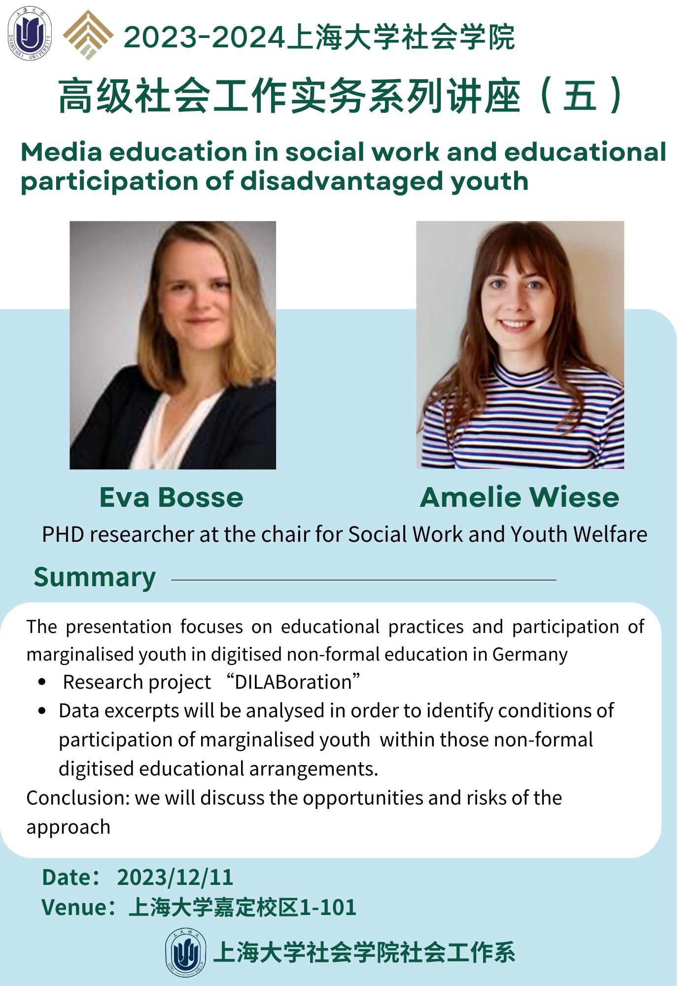 主讲人:Eva Bosse & Amelie Wiese,PHD researcher at the chair for Social Work and Youth Welfare