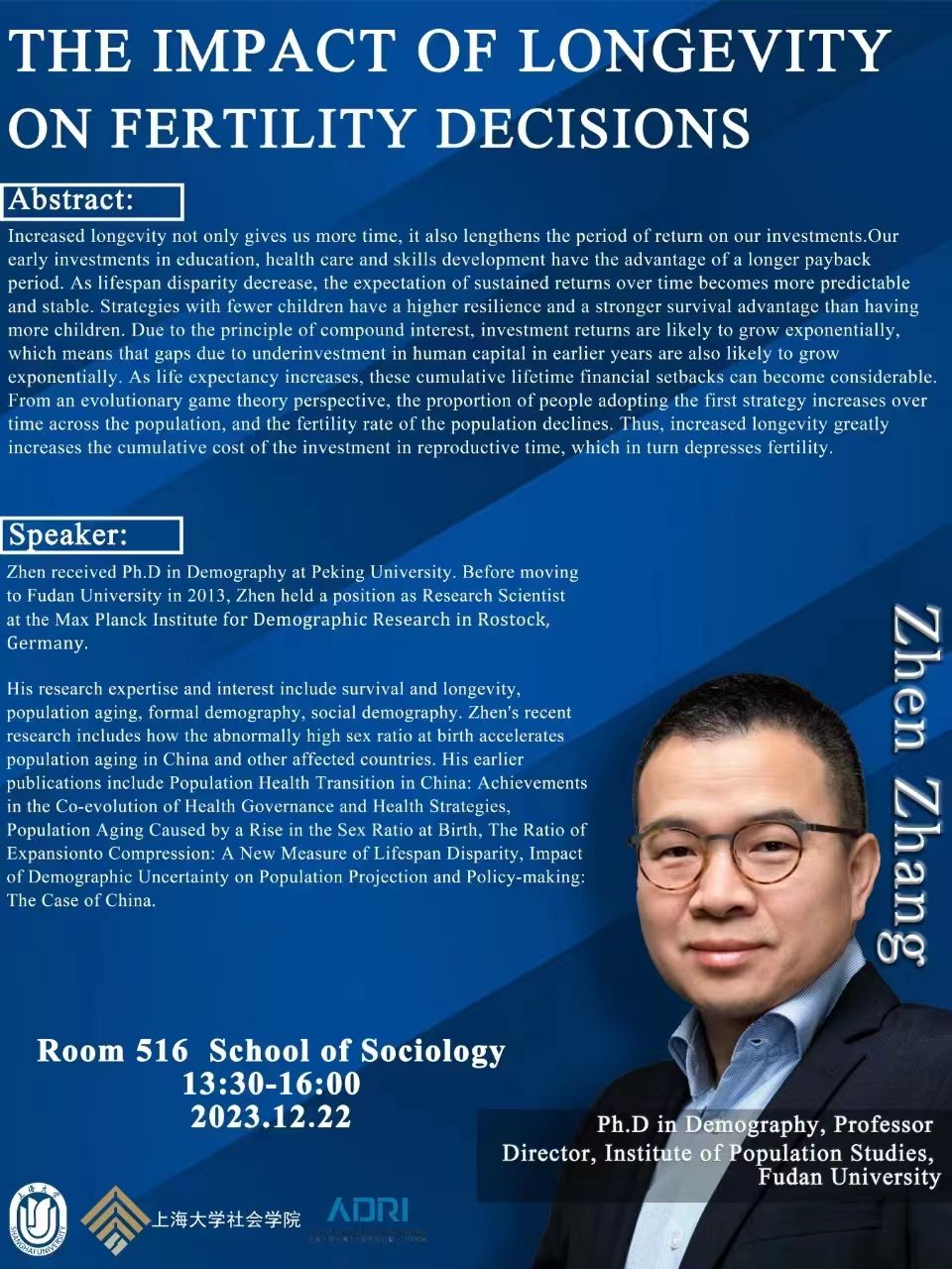 主讲人:Pro. Zhen Zhang, Ph.D in Demography, Director of Institute of Population Studies, Fudan University. His research expertise and interest include survival and longevity, population aging, formal demography, social demography. Zhen's recent research includes how the abnormally high sex ratio at birth accelerates population aging in China and other affected countries. His earlier publications include Population Health Transition in China: Achievements in the Co-evolution of Health Governance and Health Strategies, Population Aging Caused by a Rise in the Sex Ratio at Birth, The Ratio of Expansion to Compression: A New Measure of Lifespan Disparity, Impact of Demographic Uncertainty on Population Projection and Policy-making: The Case of China. Zhen received Ph.D in Demography at Peking University. Before moving to Fudan University in 2013, Zhen held a position as Research Scientist at the Max Planck Institute for Demographic Research in Rostock, Germany.