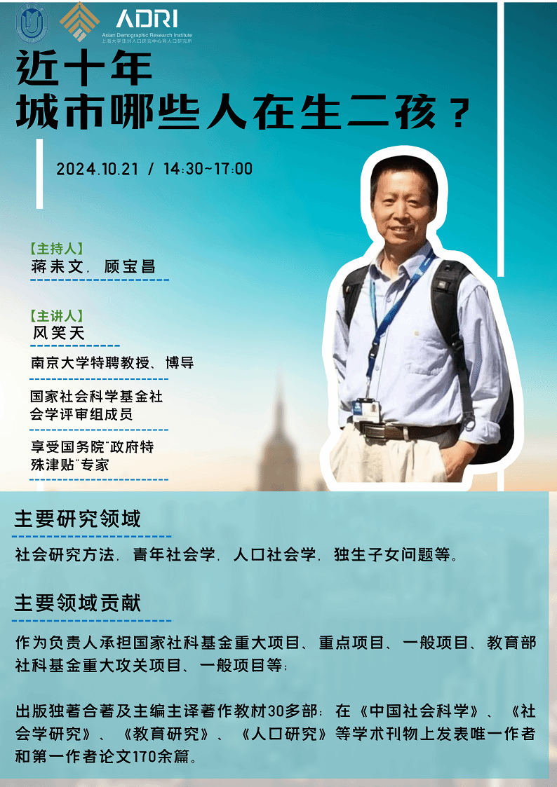 主讲人:风笑天,北京大学社会学博士。南京大学特聘教授,博士生导师;国家社会科学基金社会学评审组成员;享受国务院“政府特殊津贴”专家。曾任教育部社会学学科教学指导委员会第一届、第二届委员;湖北省社会学会常务副会长,湖北省人口学会副会长,湖北省人口专家咨询委员会委员等。1996年以来,先后受聘为中国人民公安大学荣誉教授;广西师范大学讲席教授;华侨大学、南京林业大学特聘教授;浙江师范大学、中国青年政治公司客座教授;华中师范大学、华中农业大学、中南大学、南昌大学等高校兼职教授。主要研究领域为社会研究方法,青年社会学,人口社会学,独生子女问题等。作为负责人承担国家社科基金重大项目、重点项目、一般项目、教育部社科基金重大攻关项目、一般项目等;出版独著、合著、及主编、主译著作、教材30多部;在《中国社会科学》、《社会学研究》、《教育研究》、《人口研究》等学术刊物上发表唯一作者和第一作者论文170余篇。