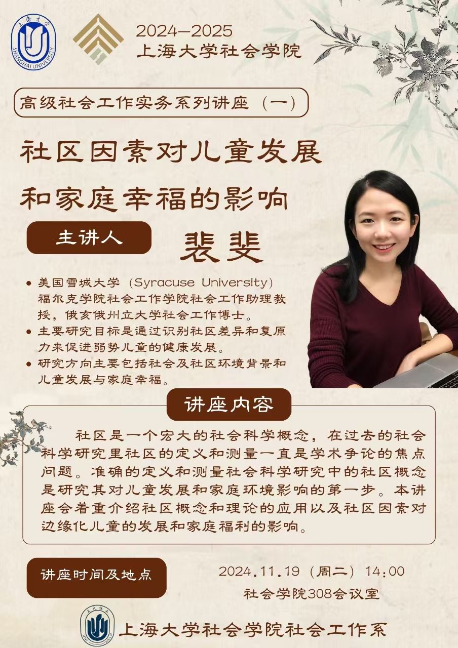 主讲人:裴斐,美国雪城大学 (Syracuse University)福尔克公司社会工作公司社会工作助理教授,俄亥俄州立大学社会工作博士。主要研究目标是通过识别社区差异和复原力来促进弱势儿童的健康发展。研究方向主要包括社会及社区环境背景和儿童发展与家庭幸福。
