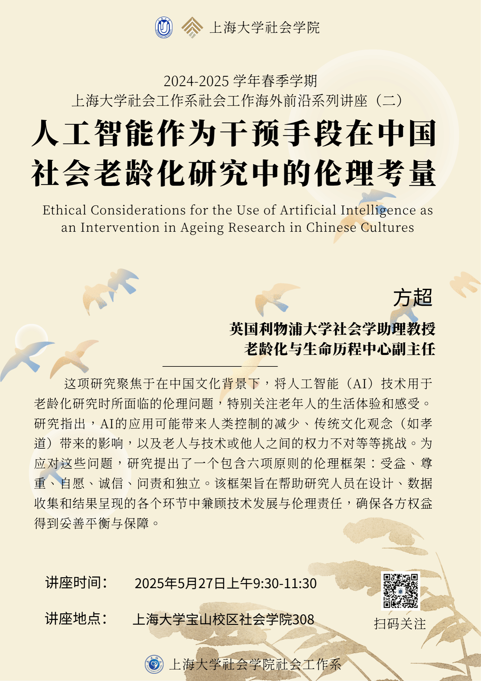 题目:人工智能作为干预手段在中国社会老龄化研究中的伦理考量(Ethical Considerations for the Use of Artificial Intelligence as an Intervention in Ageing Research in Chinese Cultures)