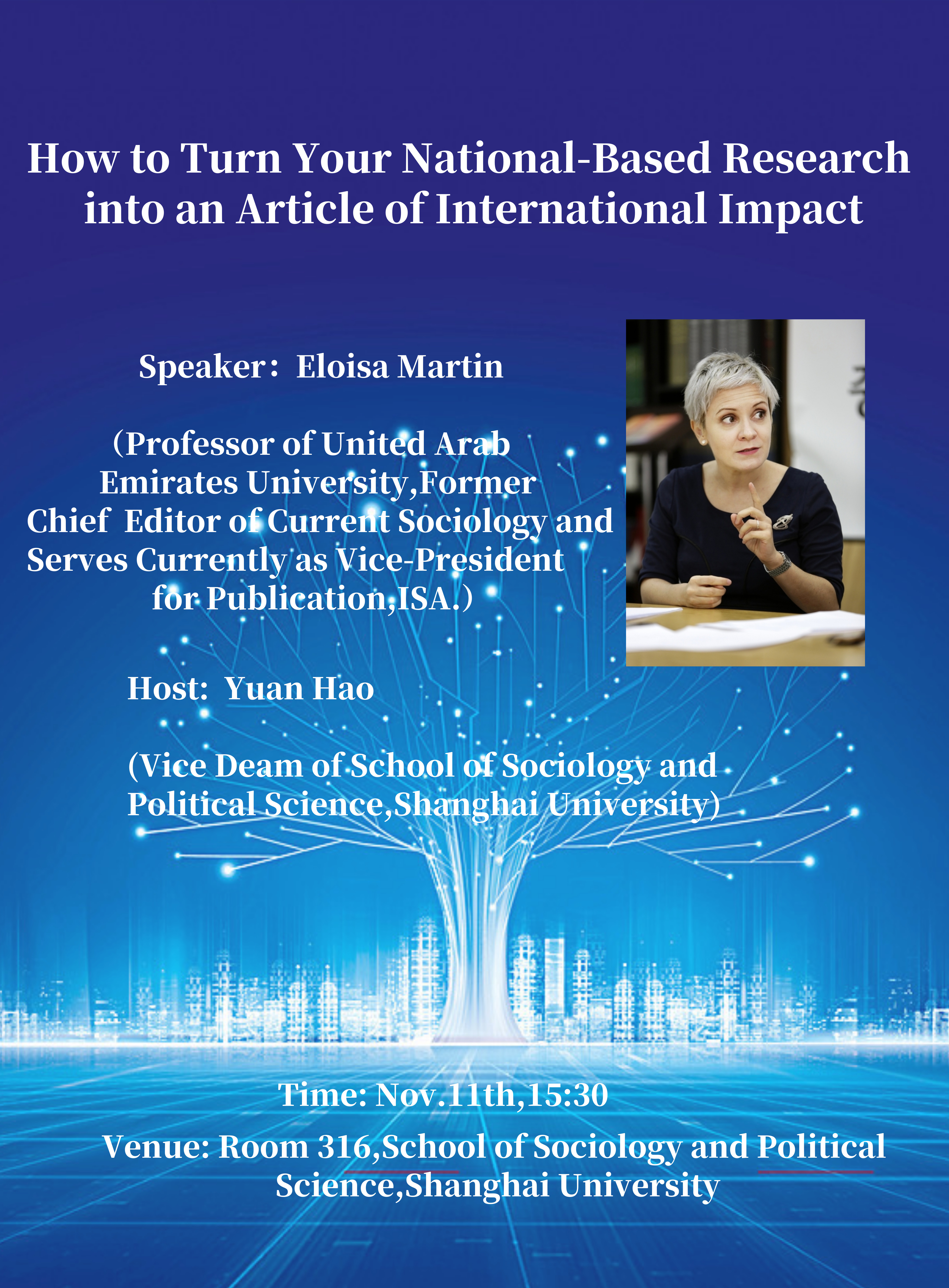 Prof. Eloisa Martinteaching at United Arab Emirates UniversityShe was former chief editor of Current Sociology and serves currently as Vice-President for publication, ISA.国际社会学会《当代社会学》前主编,现任国际社会学会期刊副主管。
