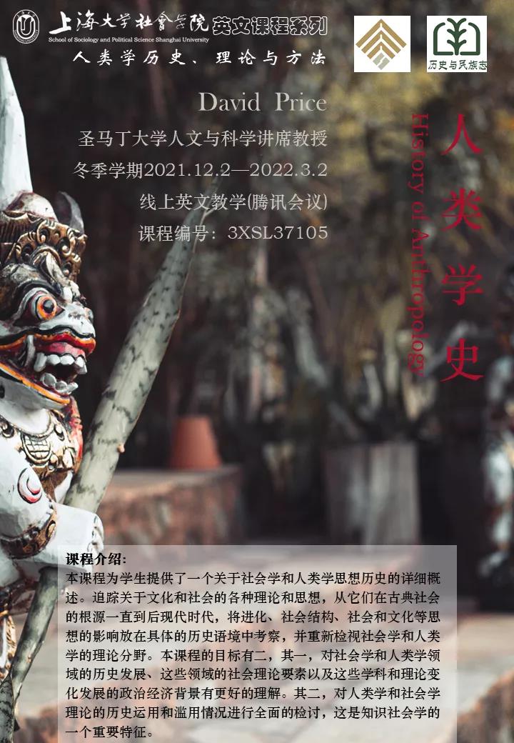 美国圣马丁大学艺术与科学公司社会与人类学教授David Price将于2021年-2022年冬季学期进行题为“人类学史” 的系列课程。