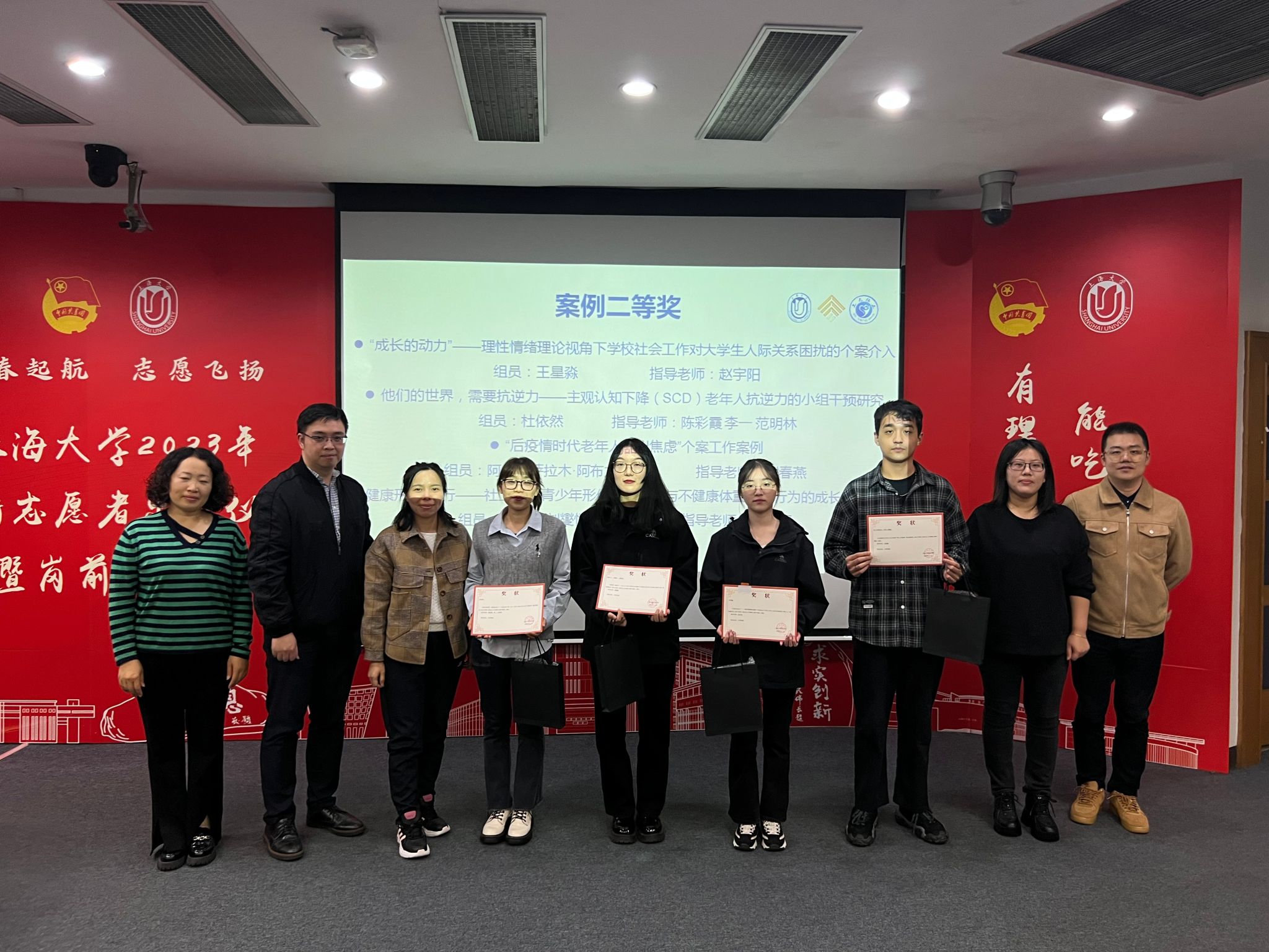 随后,系主任程明明老师宣布3044永利集团第三届社会工作案例大赛获奖名单和2022-2023年度3044永利集团社会工作系优秀实习基地名单。张乃琴及实践基地的督导专家为获得本次大赛一二三等奖的优秀案例和团队颁发了荣誉证书。张乃琴、程明明、阳方为上海申爱社会工作发展中心等15家优秀实习基地颁发奖杯。程明明为获奖员工和优秀实习基地送上由衷的祝福和感谢,表示此次案例大赛有效地激发了同学们在实践中反思与创造、促进了实践成果的转化。