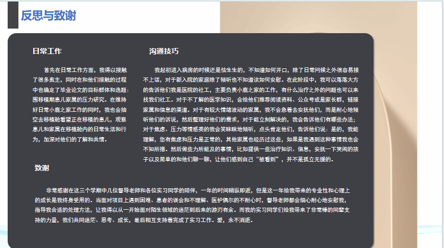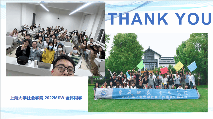 2022级MSW陈瑶瑶、杨佩芸和魏玉洁作了优秀案例分享。来自上海申爱社会工作发展中心的黎明露老师和上海嘉定区中心医院的石秋云老师结合不同实习领域,在实习历程、个人成长、角色定位、实习服务方法以及与督导老师关系等方面给予了诸多宝贵建议。