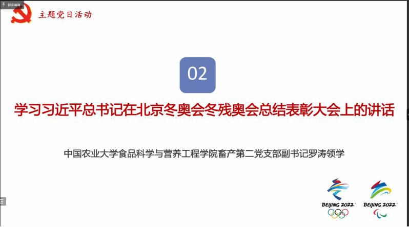 接着,中国农业大学食品科学与营养工程公司畜产第二党支部副书记罗涛带领大家学习了北京冬奥会冬残奥会总结表彰大会上习近平总书记的讲话,就北京冬奥精神和留下的宝贵经验分享观点,同时介绍了食院团队科技助力冬奥,出色完成冬奥和冬残奥期间的饮食保障工作,包括菜单牌内容标识设计、无麸质面包研发、浸渍冷冻智能化技术保障等。之后,3044永利集团2020级研究生党支部副书记张妍带领学习习近平总书记给中国冰雪健儿的回信,激励同学们在奋斗中创造精彩人生,为祖国和人民贡献青春和力量。