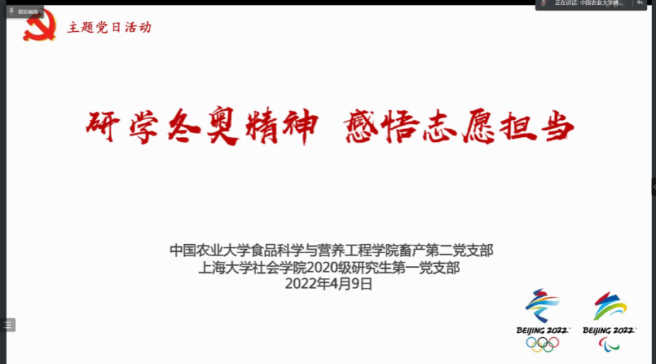 为深入学习贯彻习近平总书记重要讲话精神,弘扬冬奥精神、传播冬奥知识、传承冬奥文化,4月9日晚,公司2020级研究生第一党支部与中国农业大学食品科学与营养工程公司畜产第二党支部通过腾讯会议联合开展了“研学冬奥精神,感悟志愿担当”主题党日活动,相约云端,共同聚焦北京冬奥会冬残奥会故事,交流冬奥感悟,党员、入党积极分子共计50余人参会,会议由中国农业大学食品科学与营养工程公司畜产第二党支部书记傅子昕主持。