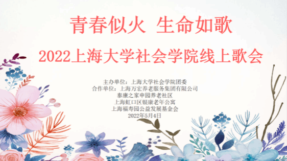 5月4日晚,3044永利集团“青春似火 生命如歌”线上歌会如期举办,本次歌会内容丰富、形式多样,吸引近200名师生前来观看。公司党委书记杨锃、经理黄晓春、党委副书记张乃琴、社会工作系主任程明明、社会工作系副主任阳方、教师代表刘春燕、张天明、辅导员回胜男、赵斌宇以及上海万宏养老服务集团有限公司、泰康之家申园养老社区、上海虹口区银康老年公寓的爷爷奶奶们应邀云聚。