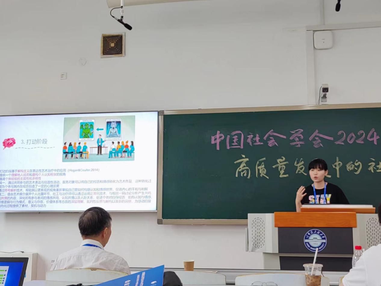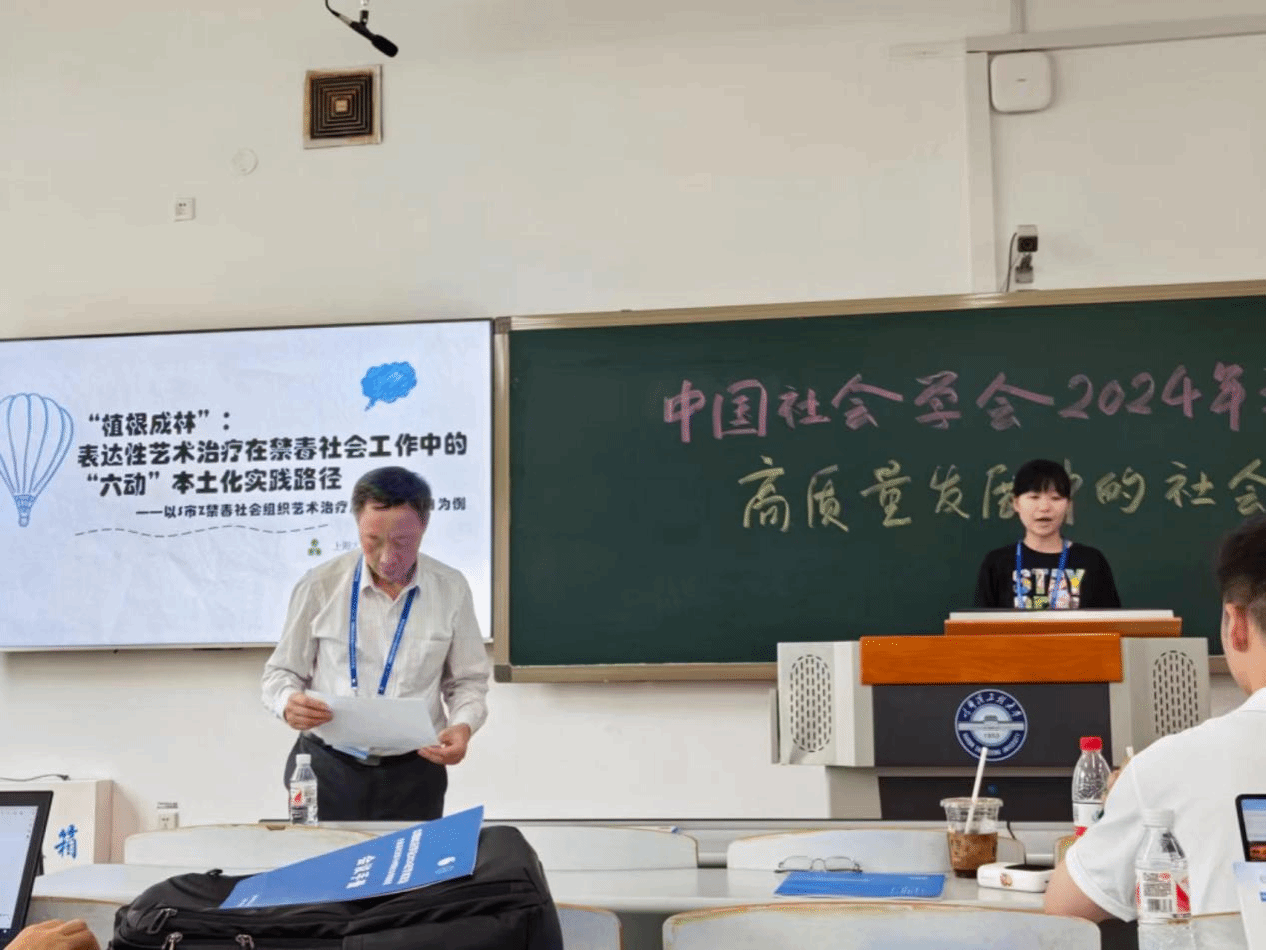 2024年7月6日,公司2021级博士研究生张芯桐,于哈尔滨工程大学参加2024年中国社会学年会-“高质量发展中的社会工作研究”分论坛(本次年会均以分论坛形式开展),在论坛上发言的论文题目为《“植根成林”:表达性艺术治疗在禁毒社会工作中的“六动”本土化实践路径——以S市Z禁毒社会组织艺术治疗应用研究项目为例》。