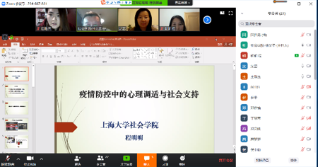 随后,社会工作系副主任程明明副教授向大家介绍了疫情最新情况,表达了对一线的医务人员和驰援的工作者们的敬意。她表示目前大家正在经历一场重大的公共卫生危机事件,可能会让人们产生一系列的压力应激性反应。她鼓励大家正视压力、稳定情绪、从容应对。同学们要时刻关于自己和家人的心理健康。因为疫情的原因大家虽被束缚在狭小的空间,每天会接触大量的疫情信息,可能会出现信息过载造成代替性创伤。同时因为疫情的蔓延人们可能会产生紧张焦虑、抑郁情绪、睡眠障碍、强迫症状、躯体症状等情况。