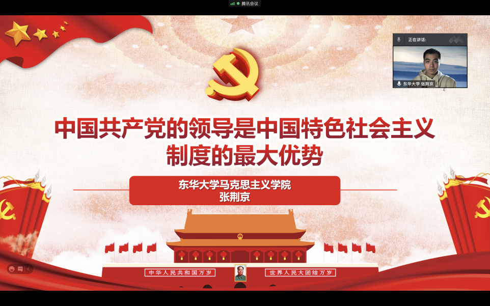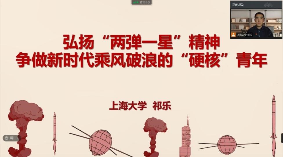 张荆京结合专业知识从历史脉络、理论内在、实践要求等三方面阐述了坚持中国共产党的领导的必要性和必然性以及党的领导是中国特色社会主义制度最大的优势所在。指出同志们要在思想上保持理论清醒和政治坚定,在实践上要不断践行自己的初心使命。祁乐则从自己的成长经历和学习感悟出发,采用讲故事的形式带领大家一起回顾了“两弹一星”的历史,激励各位青年共同努力,化“两弹一星”精神为不断进取的强大动力,成为新时代乘风破浪的“硬核”青年,为全面建设社会主义现代化强国贡献青春力量。