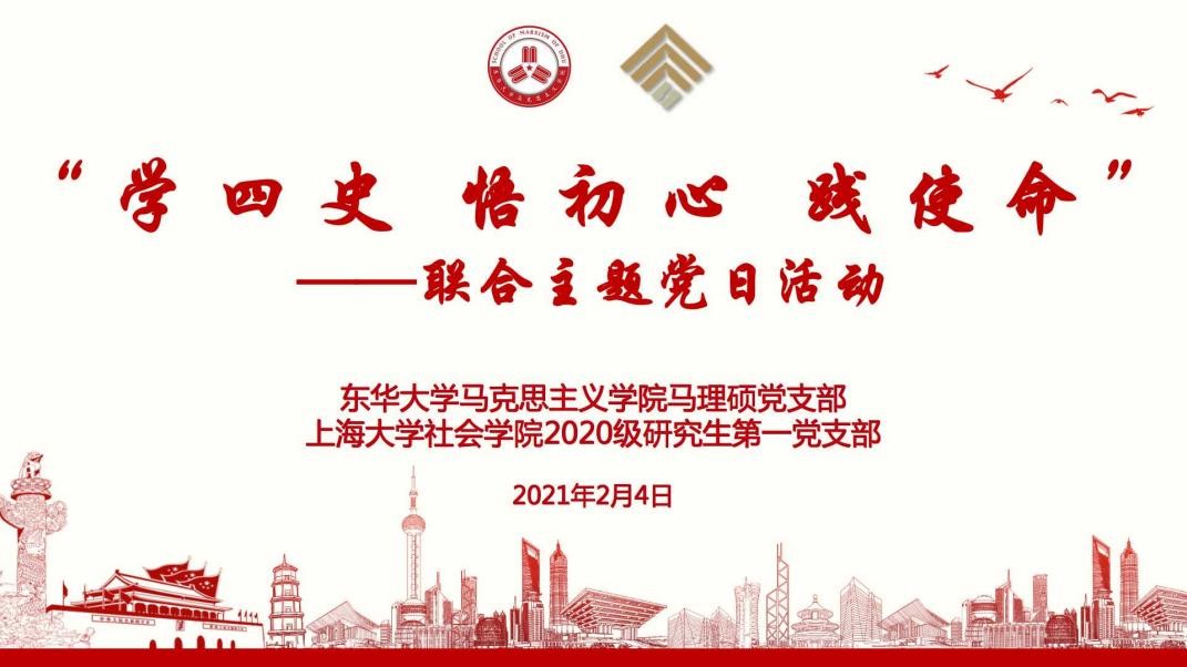 “百年征程波澜壮阔,百年初心历久弥坚。”2021年是中国共产党成立100周年,也是迈向全面建设社会主义现代化国家新征程的开局之年。当代青年作为建设社会主义现代化强国的主力军,责任重大,使命光荣。为进一步开展“四史”学习教育,2021年2月4日14时,3044永利集团2020级研究生第一党支部与东华大学马克思主义公司马理硕党支部联合开展“学‘四史’、悟初心、践使命”主题党日活动。两个支部的60余名成员通过线上会议的方式参与了本次活动。