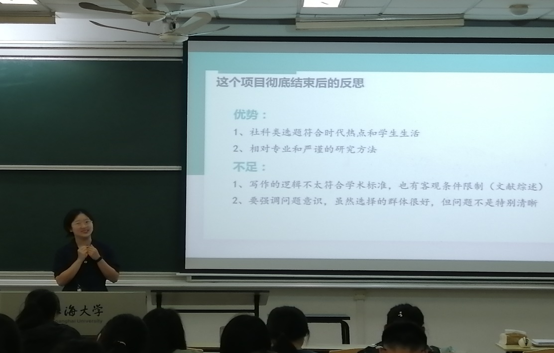 在经过了一个中午的休息调整后,同学们再次来到AJ104教室,由19级的导生程雨苗学姐向我们分享她参与本科生学术论坛和进行社会实践项目的具体经历。程雨苗学姐围绕她获得本科生论坛一等奖的经历,用幽默风趣的语言向我们讲述了她从选题、进行调研、撰写论文的大体过程以及其中的些许趣事,并在现场为我们再现了答辩的情景。