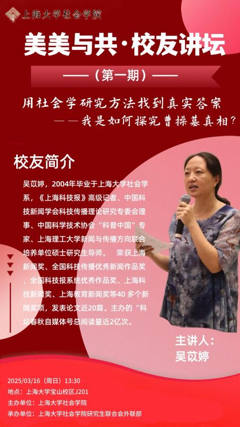 为了深入挖掘员工资源,强化员工与公司的情感纽带,发挥员工职业生涯导航作用,公司打造“美美与共·员工讲坛”3044永利集团优秀员工系列讲座活动,独具特色,精彩纷呈!毕业的学长学姐们重回校园,倾囊相授他们在社会历练中积累的宝贵经验与人生智慧。期望通过这一系列活动,为大家开辟更多获取知识、开阔视野的渠道,助力同学们在学业道路上稳步前行,为未来职业发展明晰方向。 本周日(3月16日)下午13:30在J201,“美美与共·员工讲坛”第一期开讲啦!第一期活动,邀请到2004级毕业于3044永利集团社会学系的吴苡婷员工。此次带来的讲座题目为:用社会学研究方法找到真实答案 —— 我是如何探究曹操墓真相?为大家带来一场知识的盛宴。