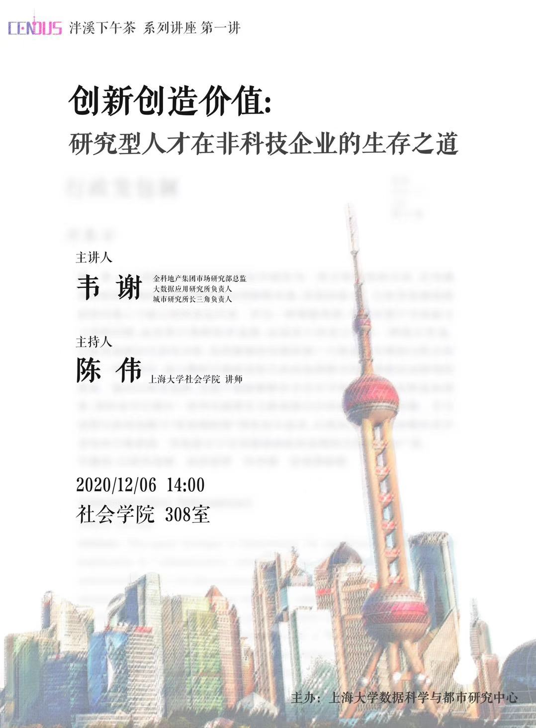 12月6日,由数据科学与都市研究中心主办的的“泮溪下午茶”第一讲开讲,邀请员工韦谢博士分享“创新创造价值:研究型人才在非科技企业的生存之道”的讲座,陈伟博士主持。
