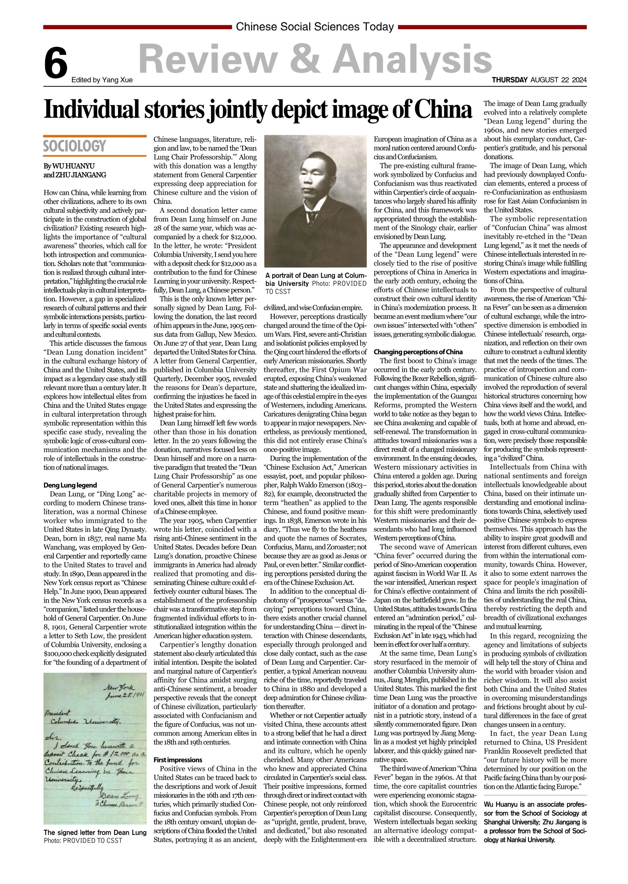 8月22日,武洹宇(第一作者)论文《海外中国观与文化主体性叙事的交互建构——以丁龙捐赠事件的传奇化过程为例》(原载《社会》2024年第2期),被《中国社会科学报》(英文版)2024年8月22日全英文转载。