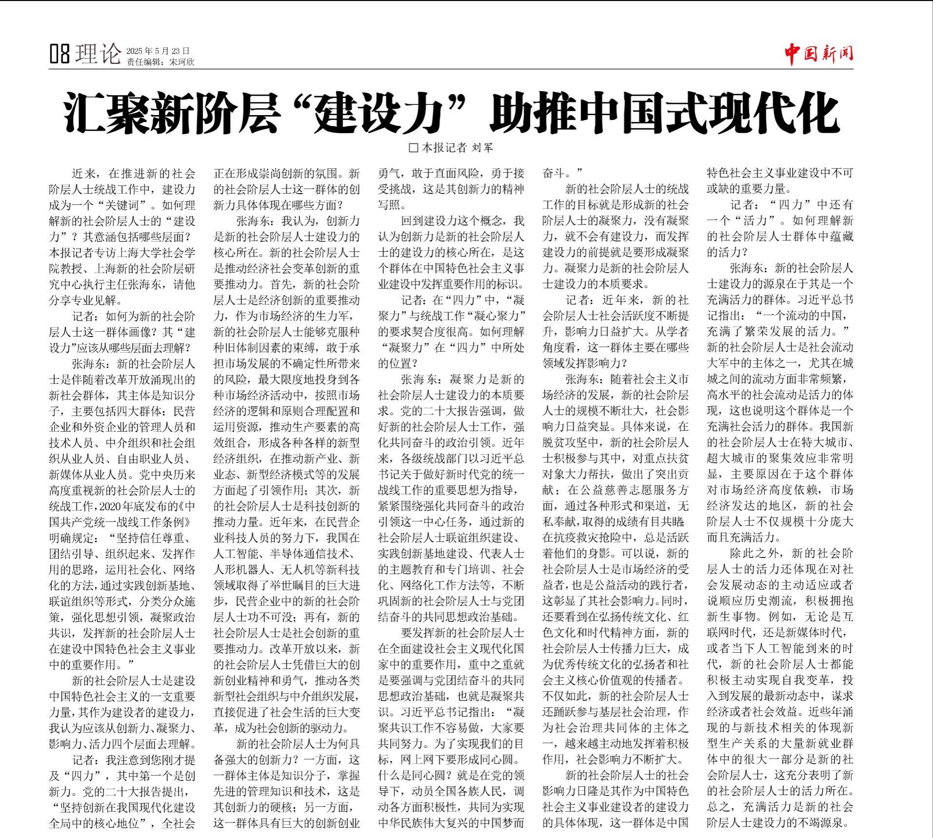 近日,上海新的社会阶层研究中心执行主任张海东教授接受中国新闻记者的采访,就“如何理解新的社会阶层人士的‘建设力’”发表观点。并刊发于《中国新闻》2025年5月23日8版理论。