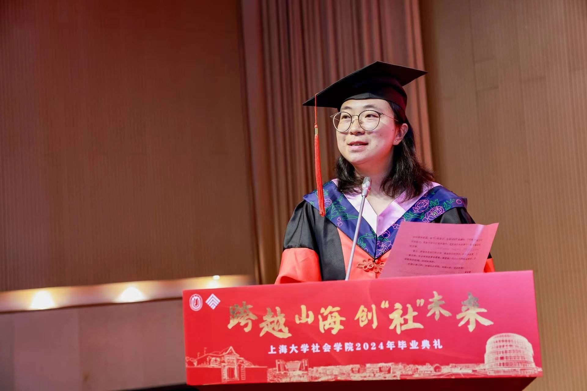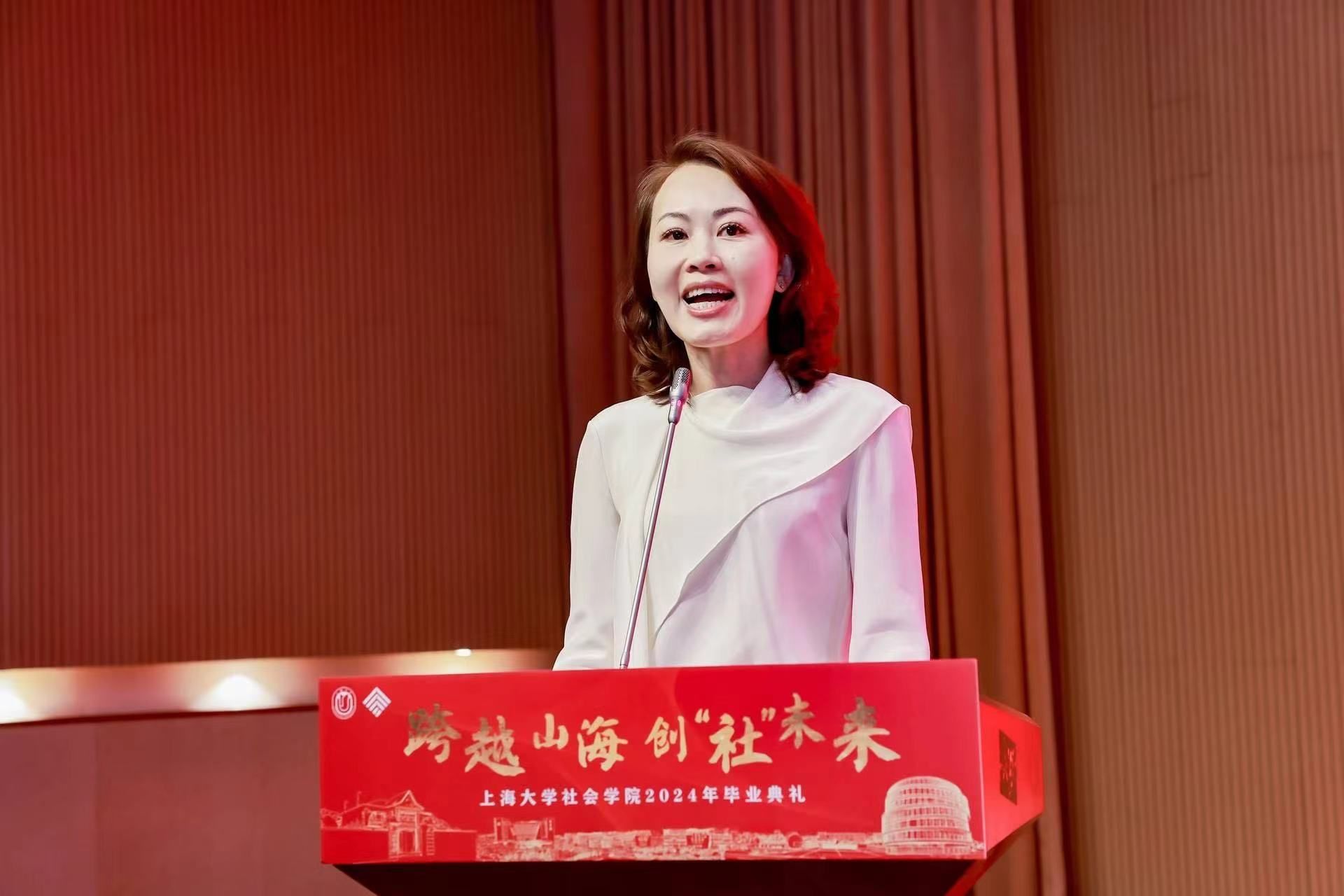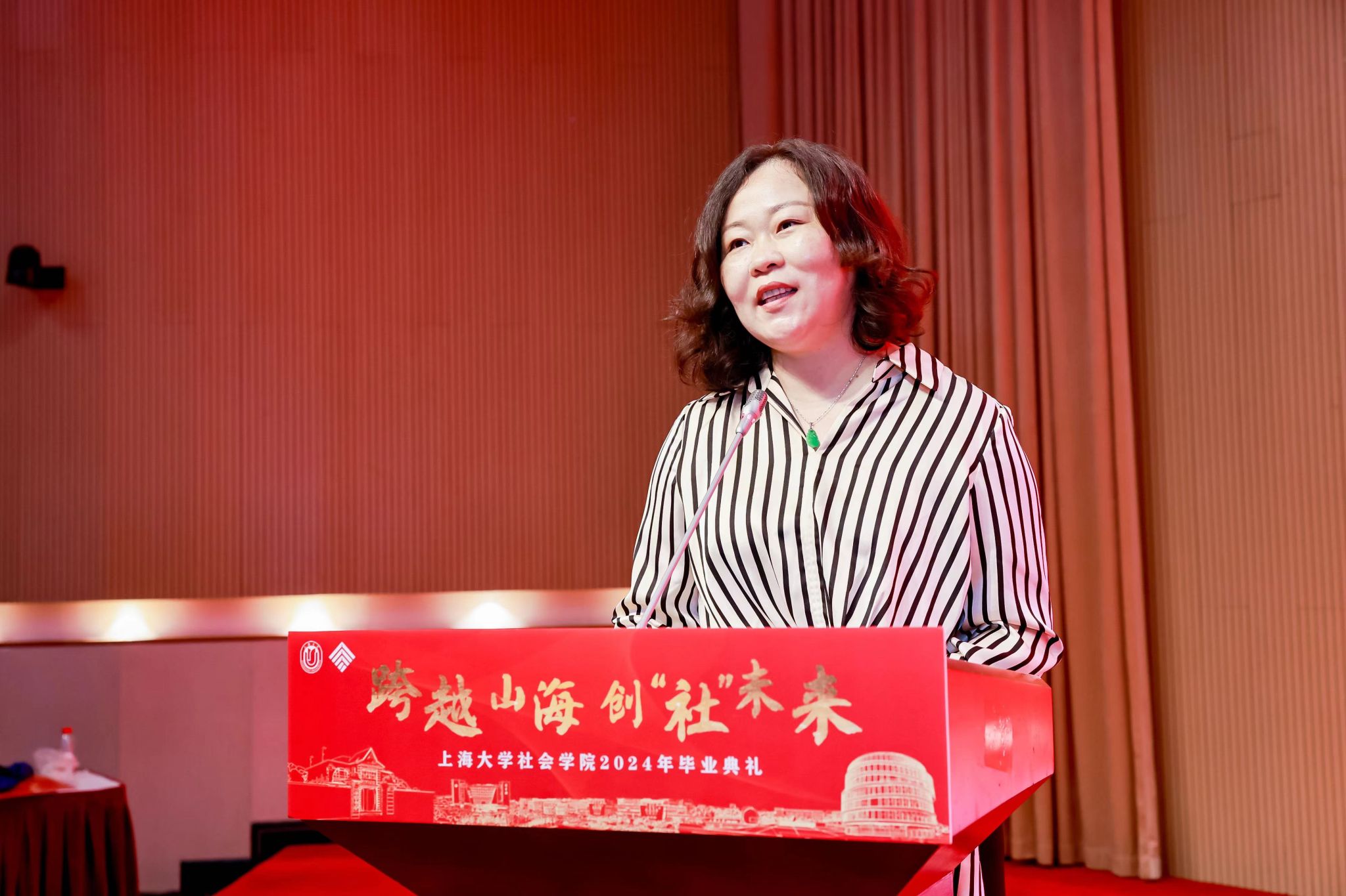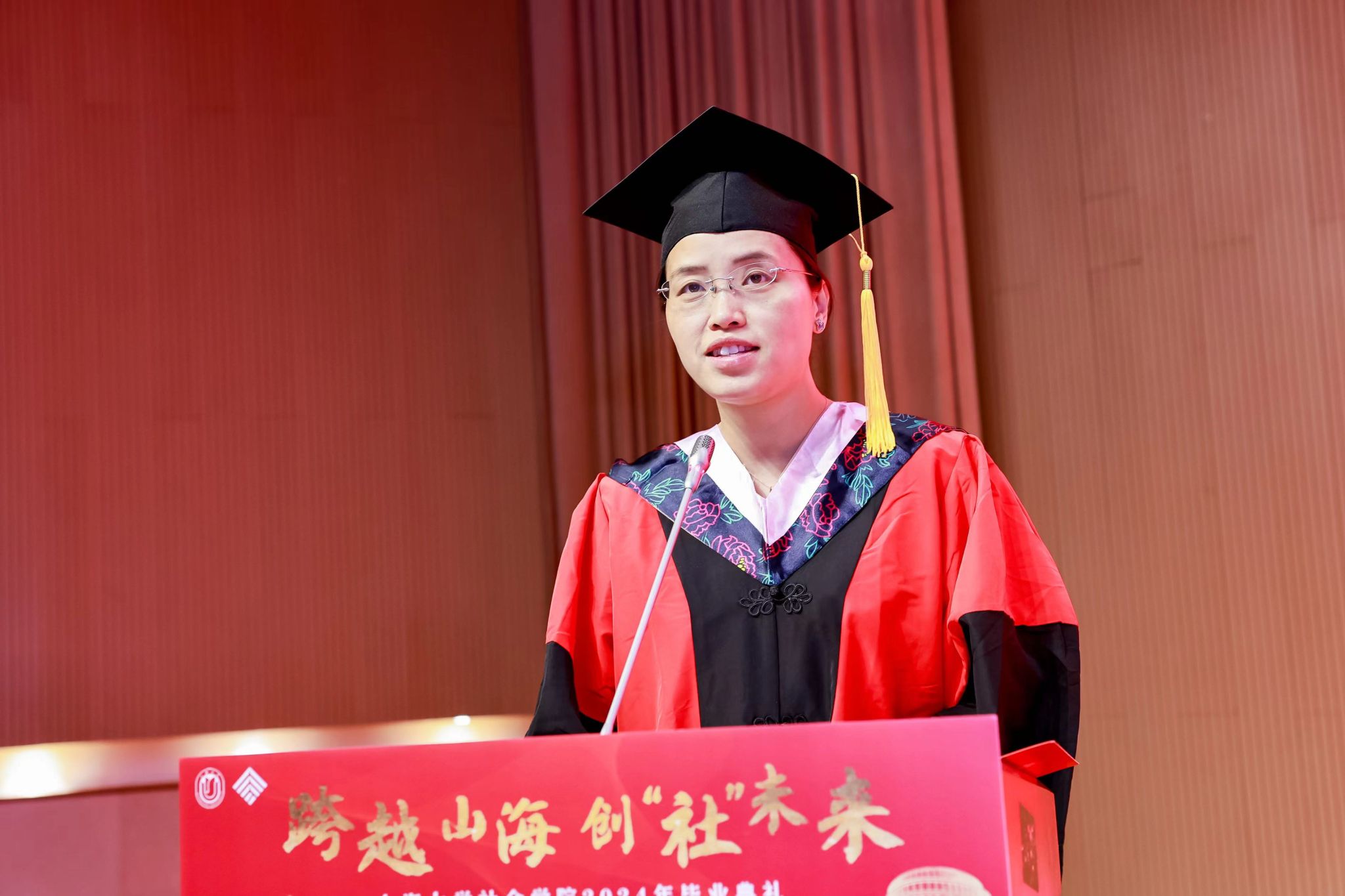 计迎春老师作为教师代表上台发言。她以“把握自己的节奏,定义自己的人生”为题,指出这一届毕业生的特点是:向上对齐,向下拓展。无论是在公司里还是职场中,我们每时每刻都在进行着“内卷”。作为社会学人,我们应当认识到这不仅仅是我们自身所造成的结果,更是由社会制度、经济下行等因素共同造成的。这种双重内卷可能造就个人的“成功”,可能造就大家的“躺平”,但更多的却是给大众制造焦虑。所以,我们更要在当下浮躁的世界中坦然面对一切,要在多元化的基础上形成共识,成为有灵魂的人;我们要决定工作的模式,创造属于自己的美丽新世界;我们要给彼此爱与希望,有前进的动力,过有意义的人生。这样,我们的未来必定可期!