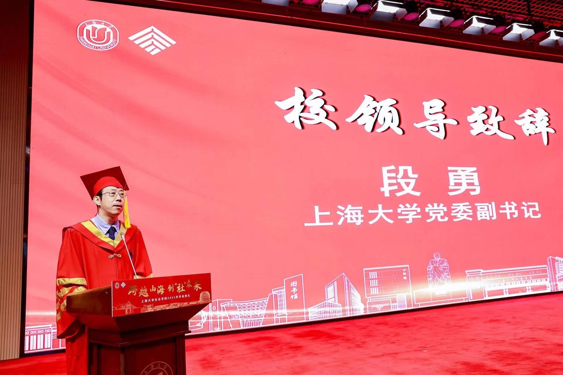典礼伊始,公司党委副书记段勇上台致辞。他表示,毕业年年情相似,年年毕业人不同。今年毕业的同学大多出生于2000年后,是中国发展进入新里程的标志性年份。新世纪里,我们已共同走过穷困,迎来繁荣。如今,生在国旗下,长在春风里的新一届毕业生们完成了又一个人生中重要的阶段,对此,他表示了衷心的祝贺。同时希望大家在面对未来学业和就业的茫然时不忘初心,相信未来。保持善良、豪情万丈的情怀,充实身心,提高自己。他指出,在今后的人生道路上,希望大家能从上大的历史中汲取养分,让那些闪耀在历史中的人物和事迹成为支持同学们的榜样,成为指引我们人生的重要力量。